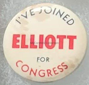 A red and white political button "I've Joined Elliott for Congress." Is a Michigan candidate, could be: Arthur Elliott (1946; 6th District), Laverne O. Elliott (1962; 16th District), Lawrence E. Elliott (1976; 1st District), Scott Elliott (1976; 17th District / 2004; 6th District).