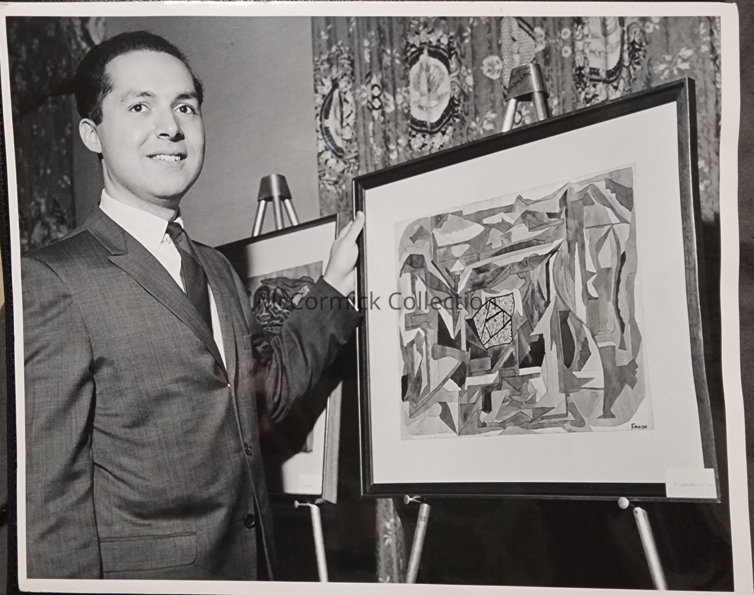 Press photograph of State Representative Jack Faxon posing with some of his abstract art in October 1965. Photo by Ed Haun of the Detroit Free Press.