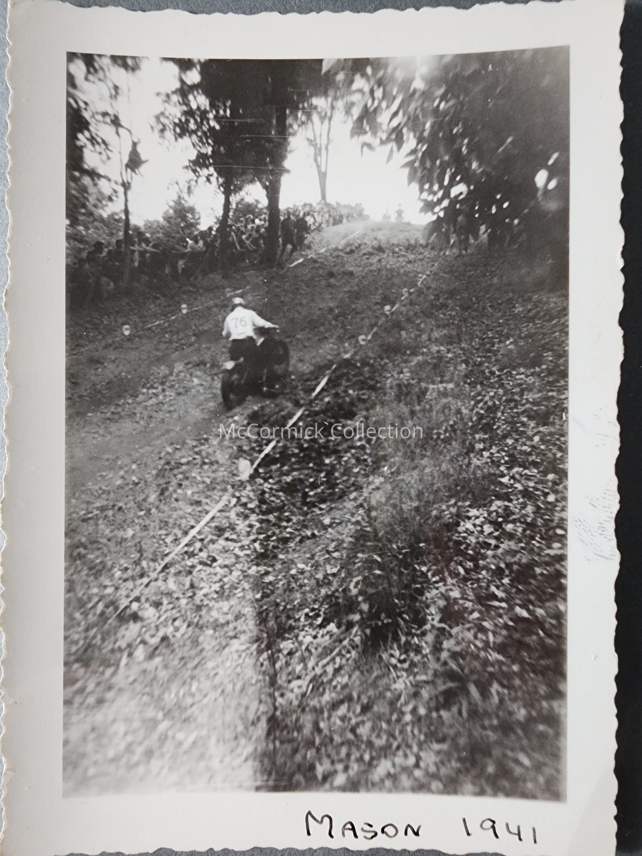 Snapshot photograph taken in Mason, Michigan, in 1941. Probably of a Jack Pine hill race Enduro.