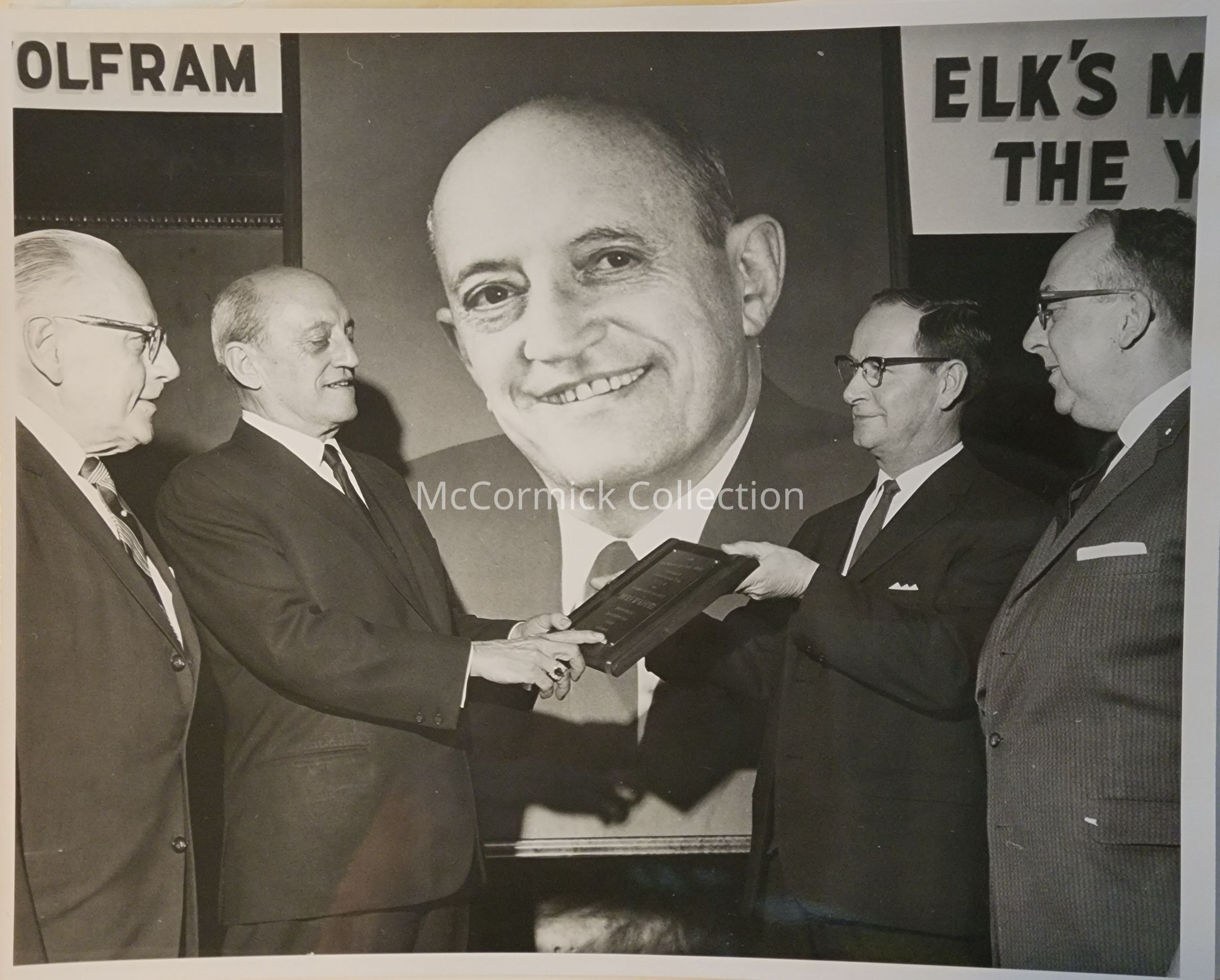 Lansing Elks Lodge awards ceremony with Willard Nelson (right) presenting Oldsmobile executive Jack Wolfram (left) with an award, the other two pictured are unknown.
