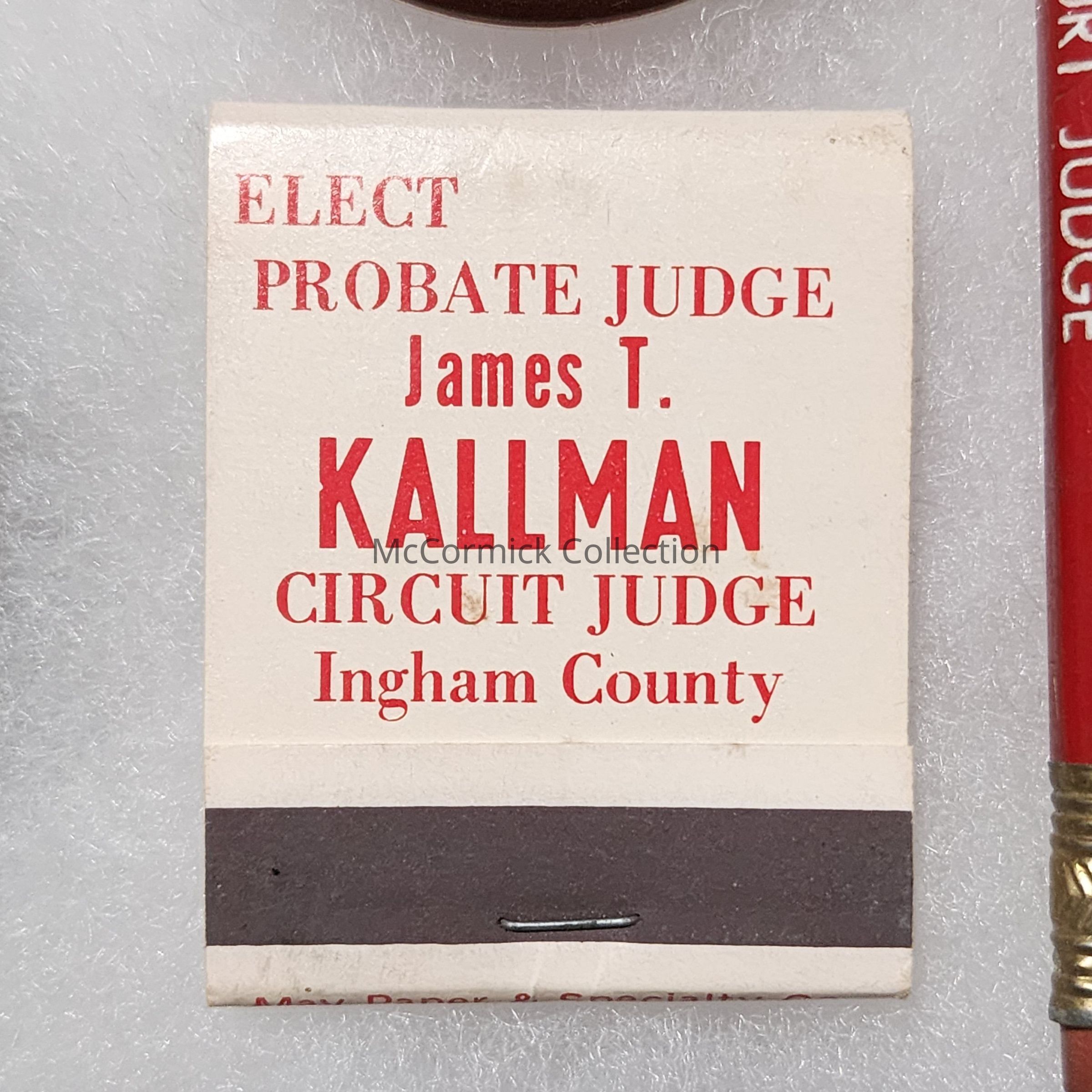 Political matchbook for James T. Kallman for Ingham County Circuit Court Judge.