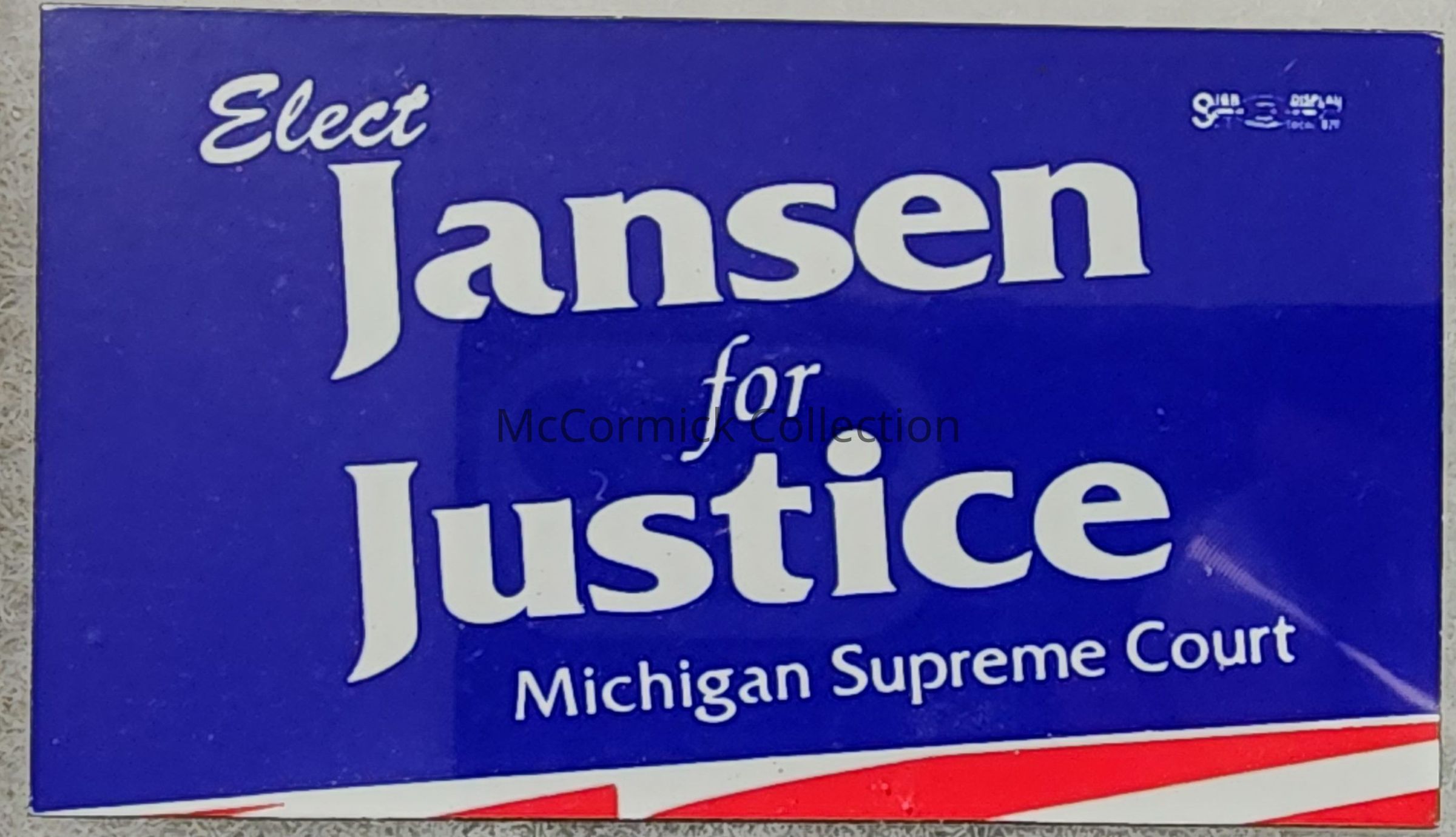 A 3.5" red, white, and blue magnet for Jansen for Justice of the Michigan Supreme Court.