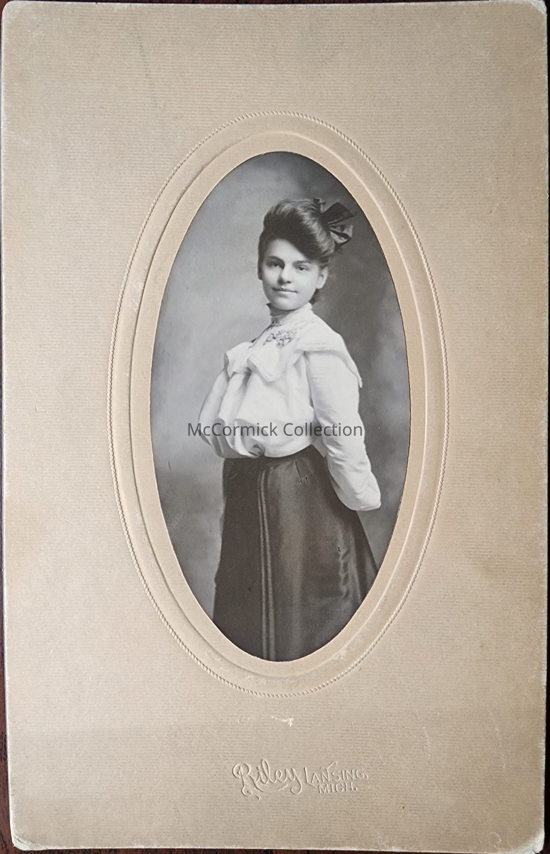 Photograph of a woman identified as Jennie Hacker (sp) by Lansing photographer Riley. From Siebert Estate.