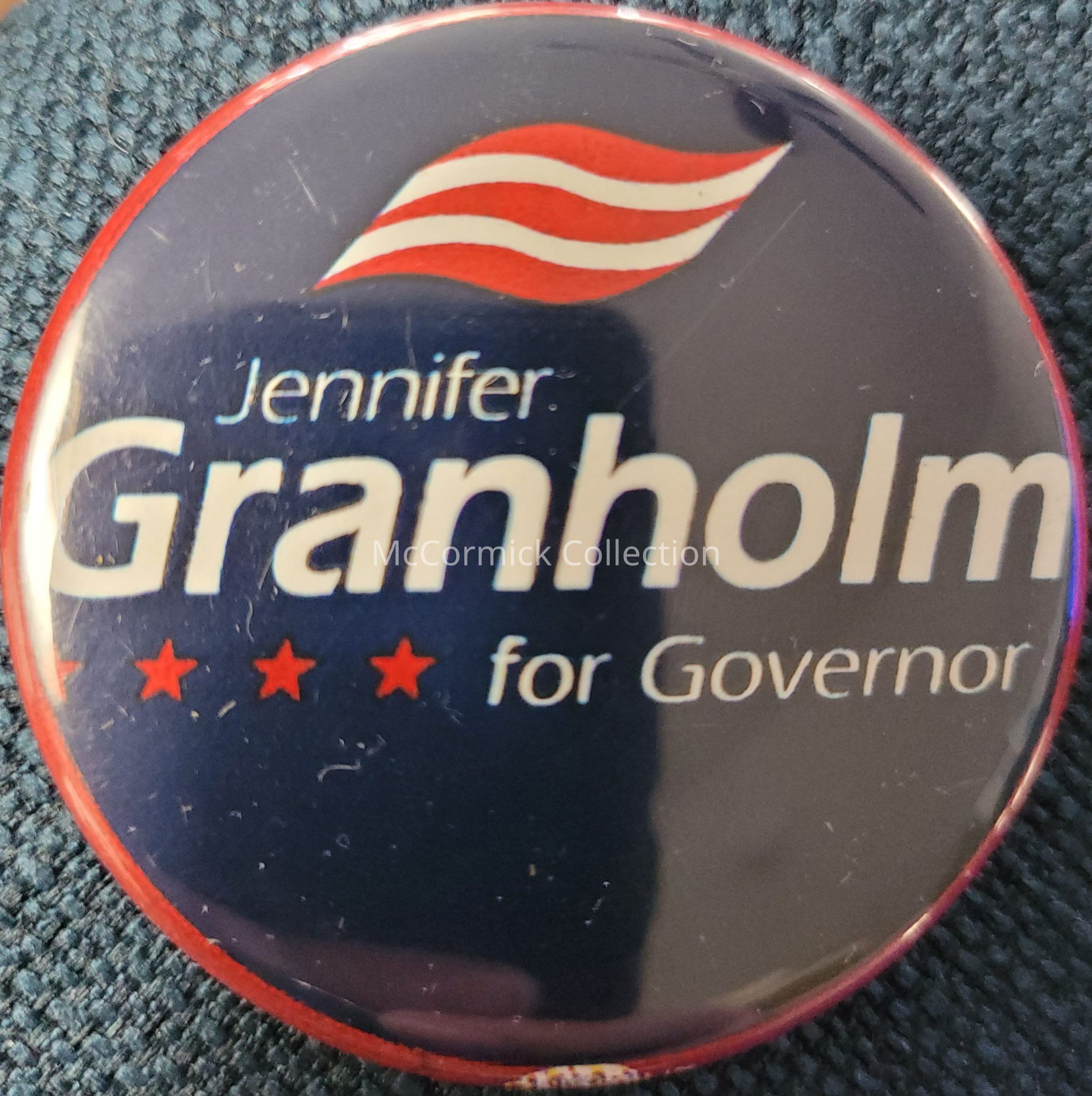 A 2.25" red, white, and blue political button for Jennifer Granholm for Governor of Michigan, circa 2002.