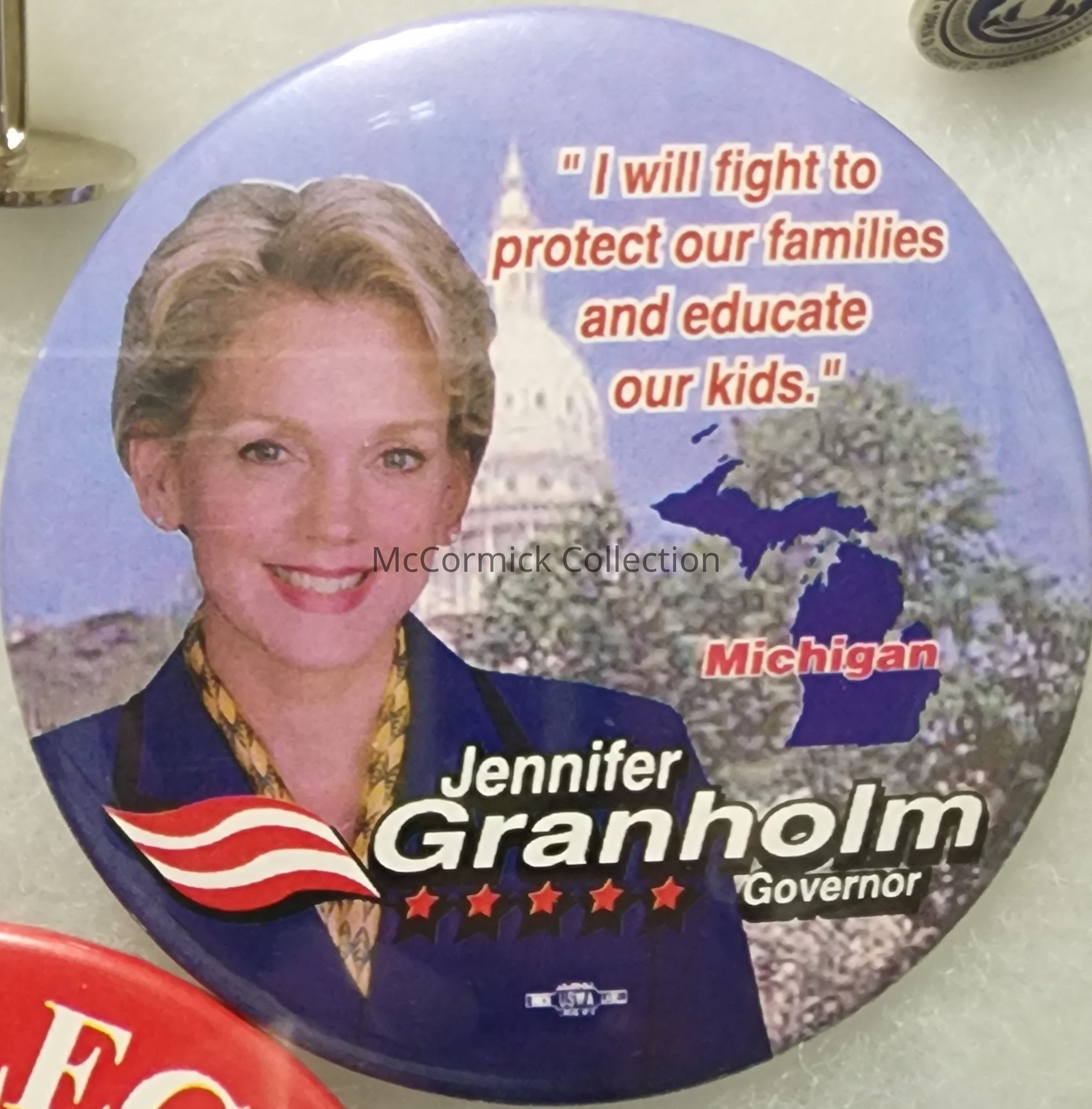 A 3" color picture button for Jennifer Granholm for Governor with "I will fight to protect our families and educate our kids" slogan.