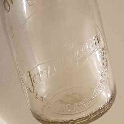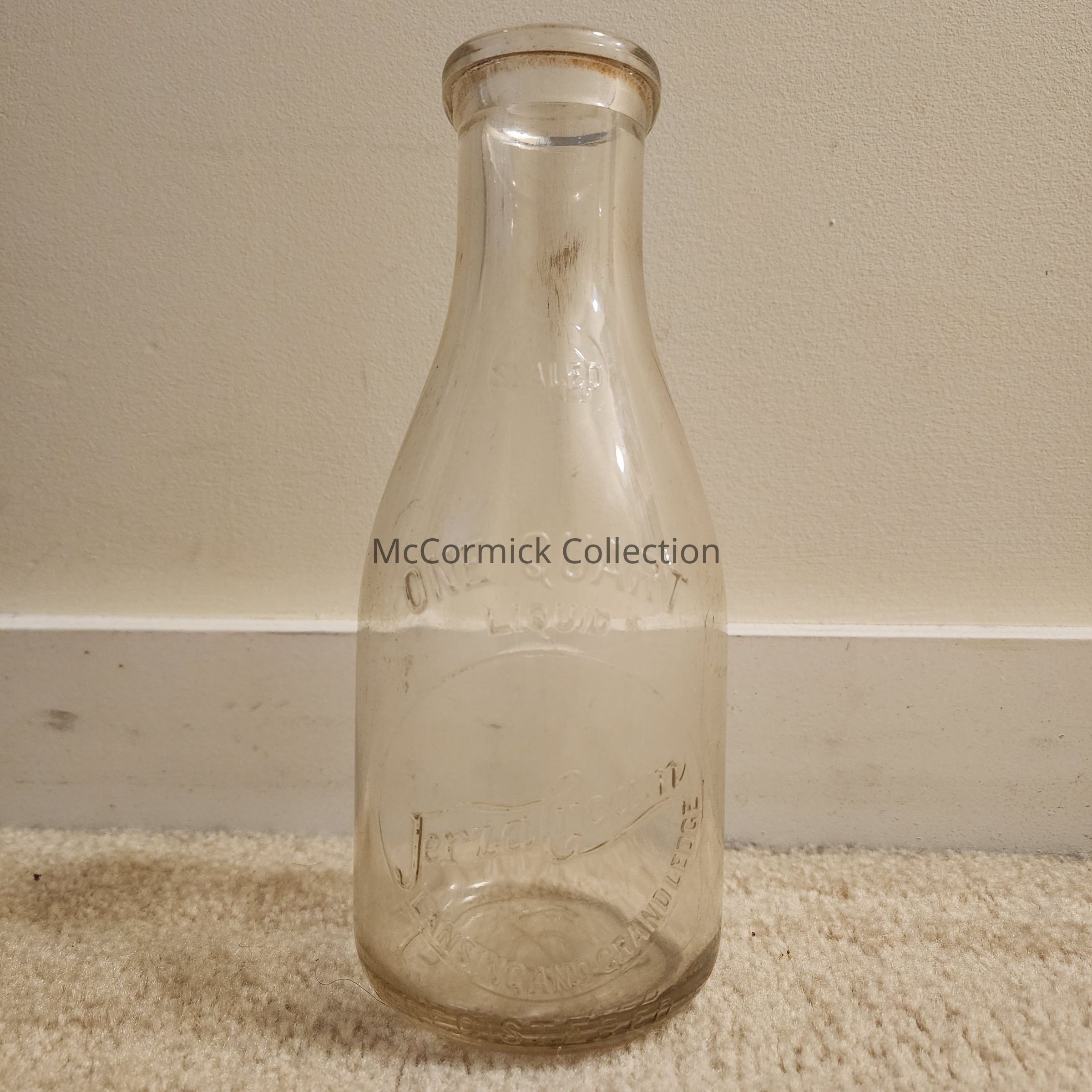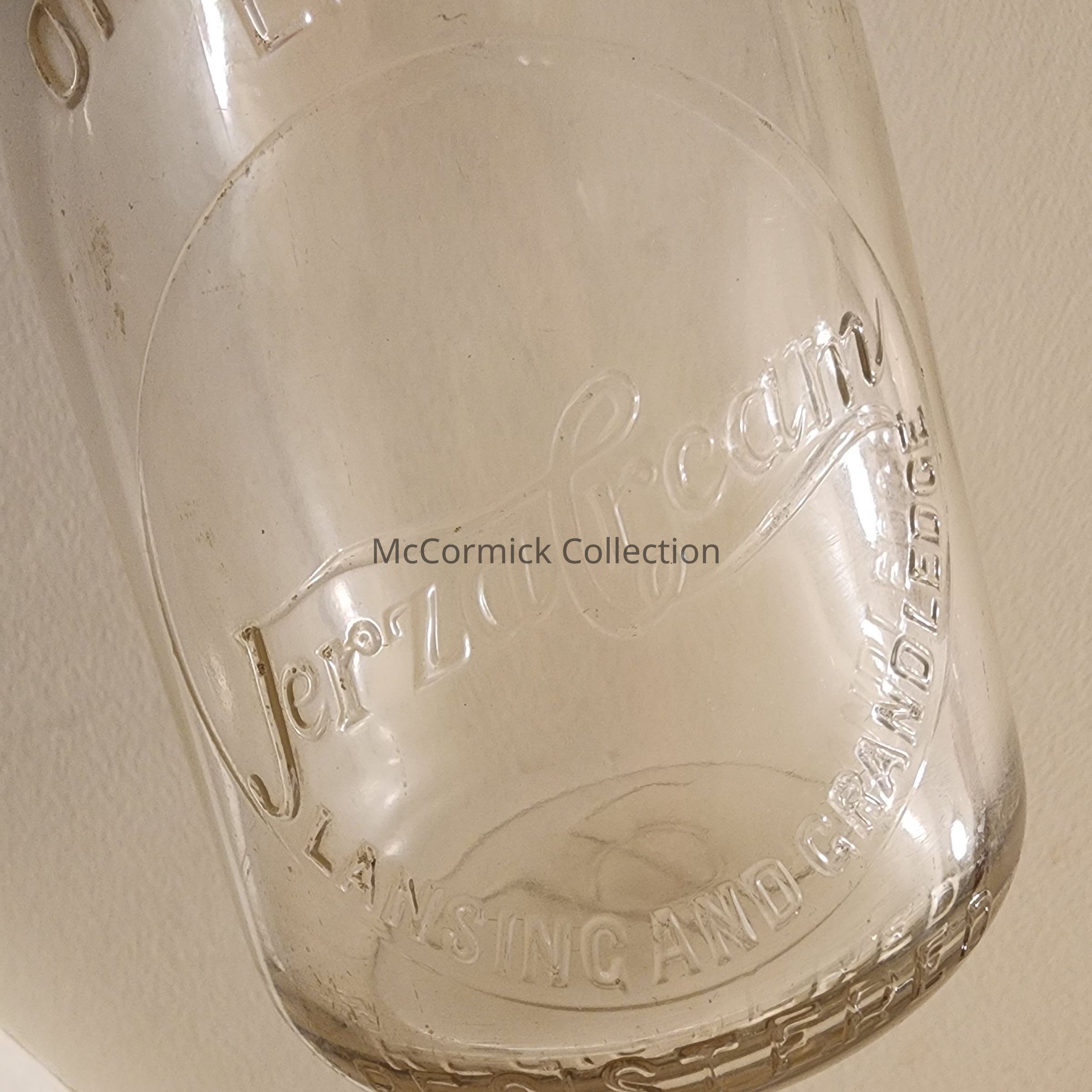 Embossed quart dairy milk bottle from Jerza Cream of Lansing and Grand Ledge, Michigan. Script logo in slug plate.