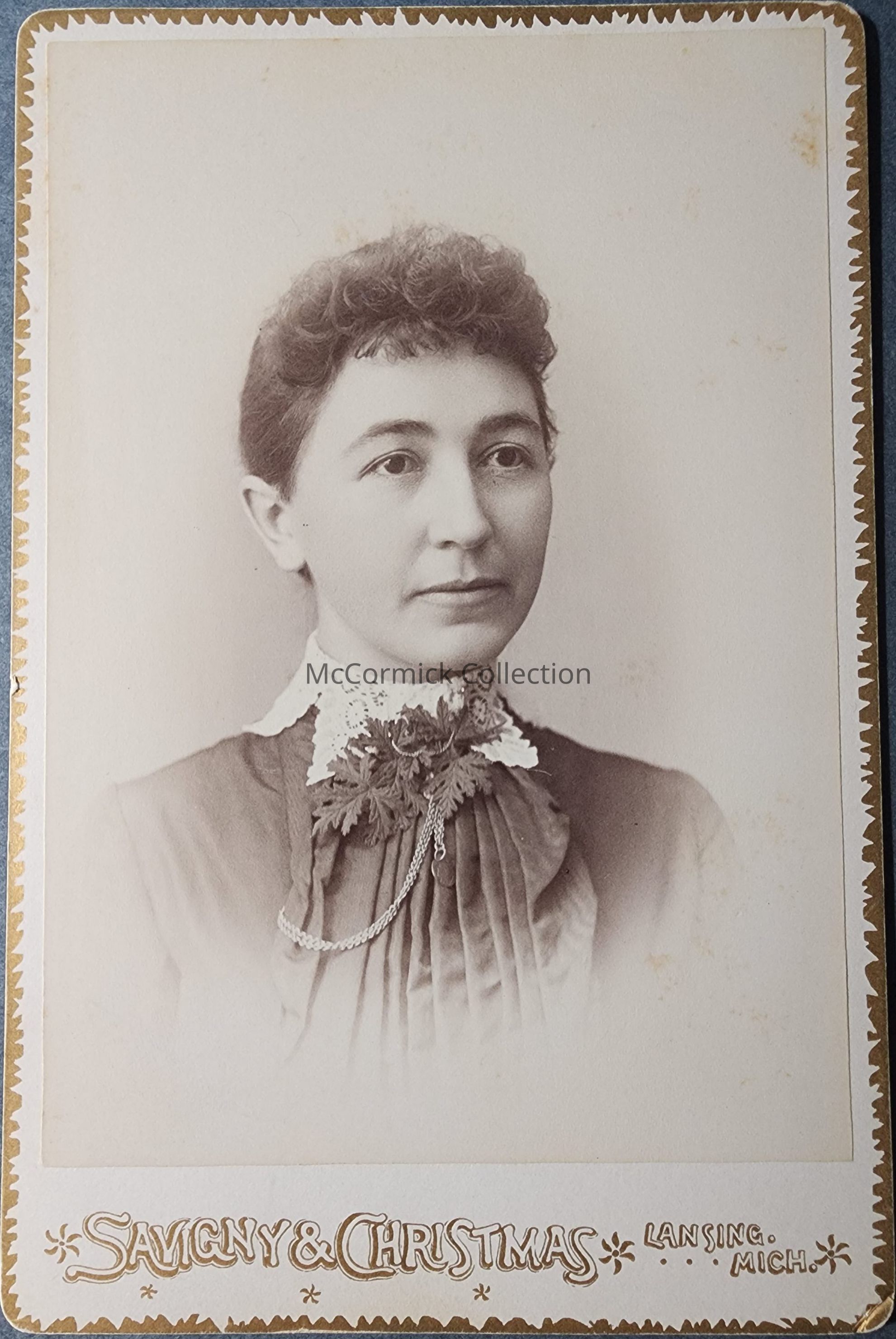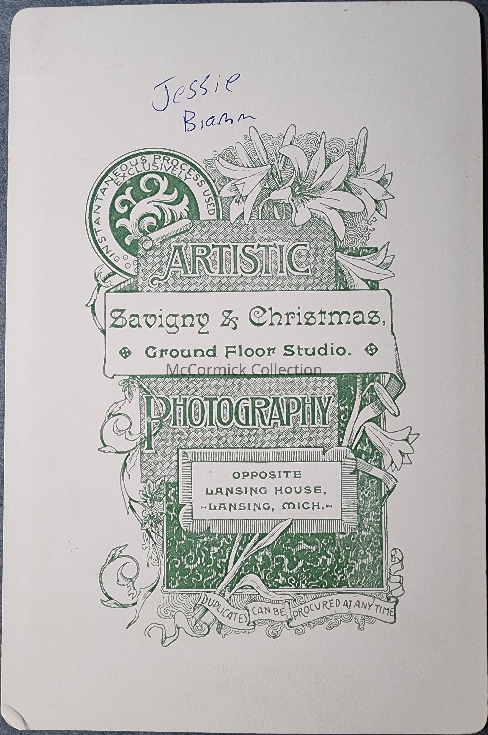 Cabinet card photograph of Jessie Bramm by Lansing photographer Savigny and Christmas.