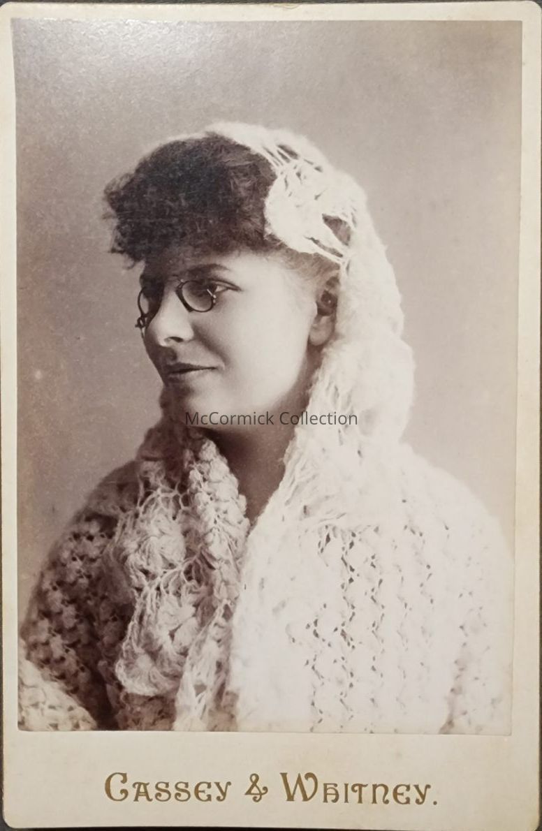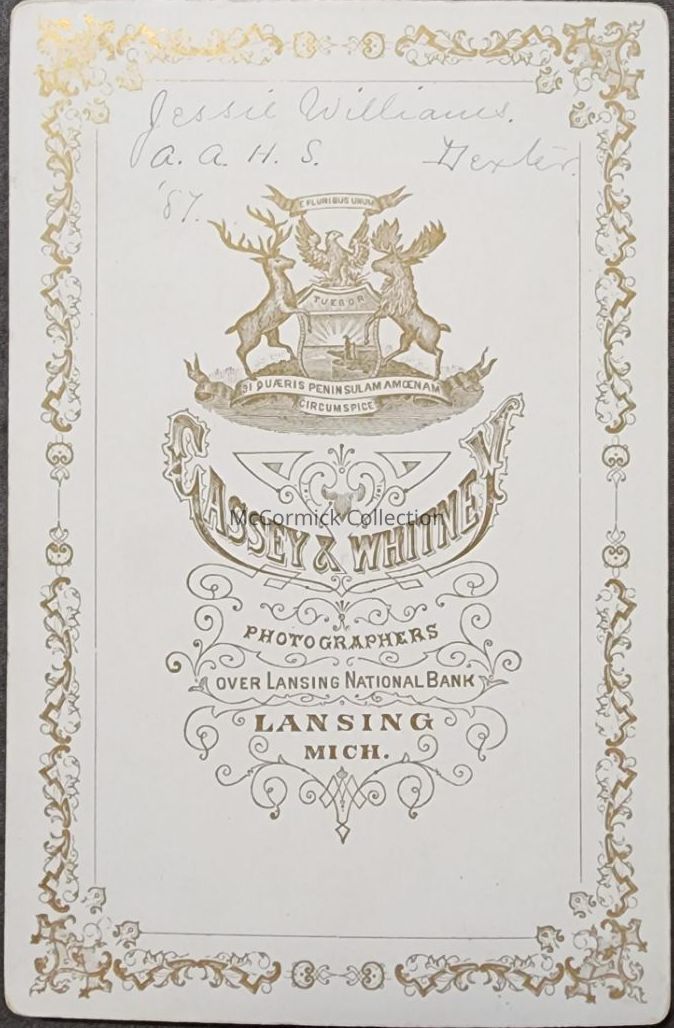 Cabinet card photograph of Jessie Williams of Dexter, graduate of Ann Arbor High School, and went on to Michigan Agricultural College, graduated in 1887. Photo by Lansing photographer Cassey and Whitney.