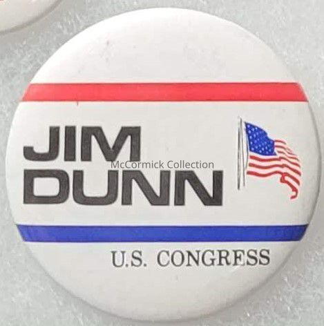 A 2.25" red, white, blue, and black political button for James Jim Dunn for U.S. Congress.