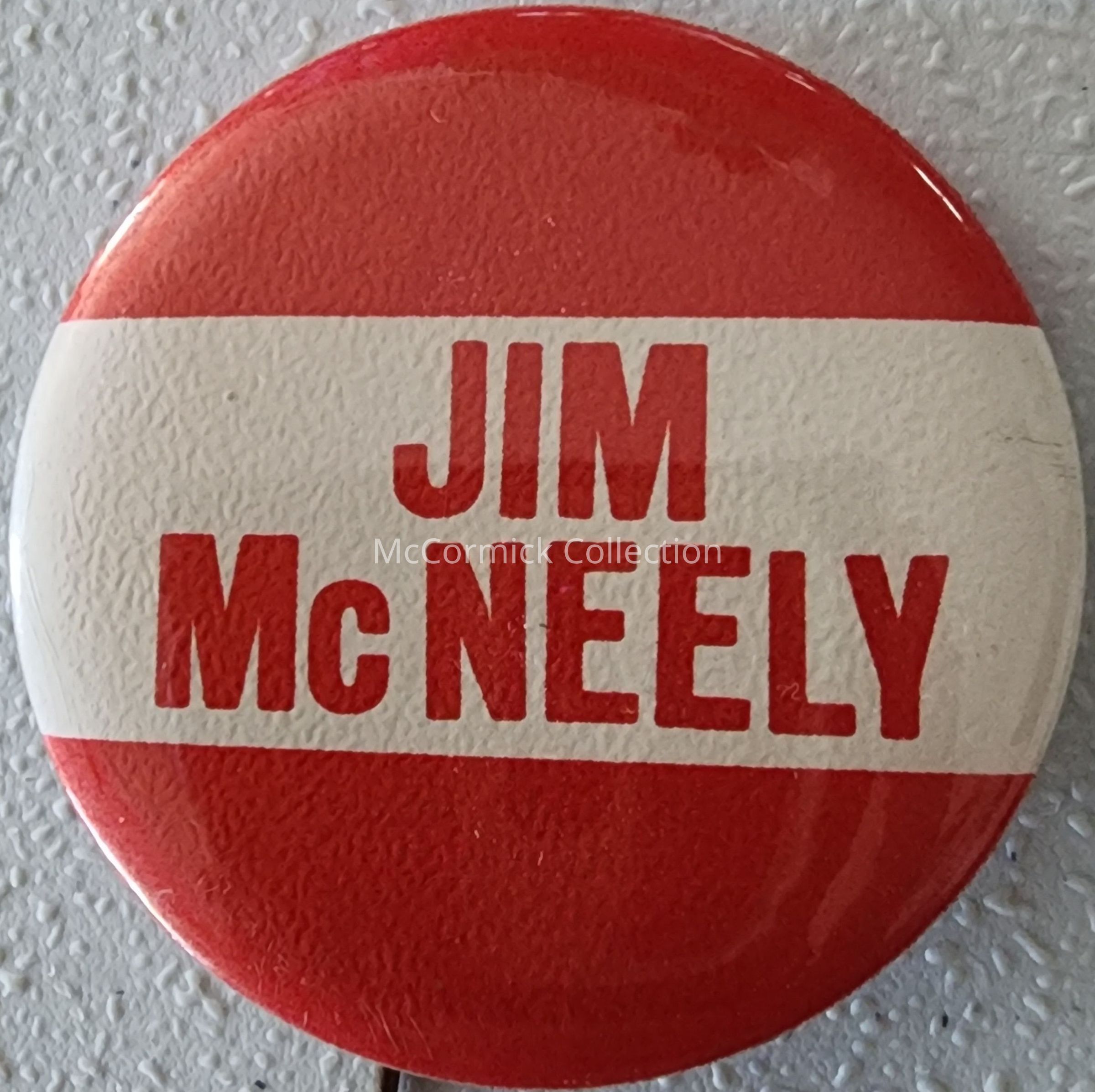 A 1.75" red and white political button for Jim McNeely, chair of the Michigan Democratic Party.