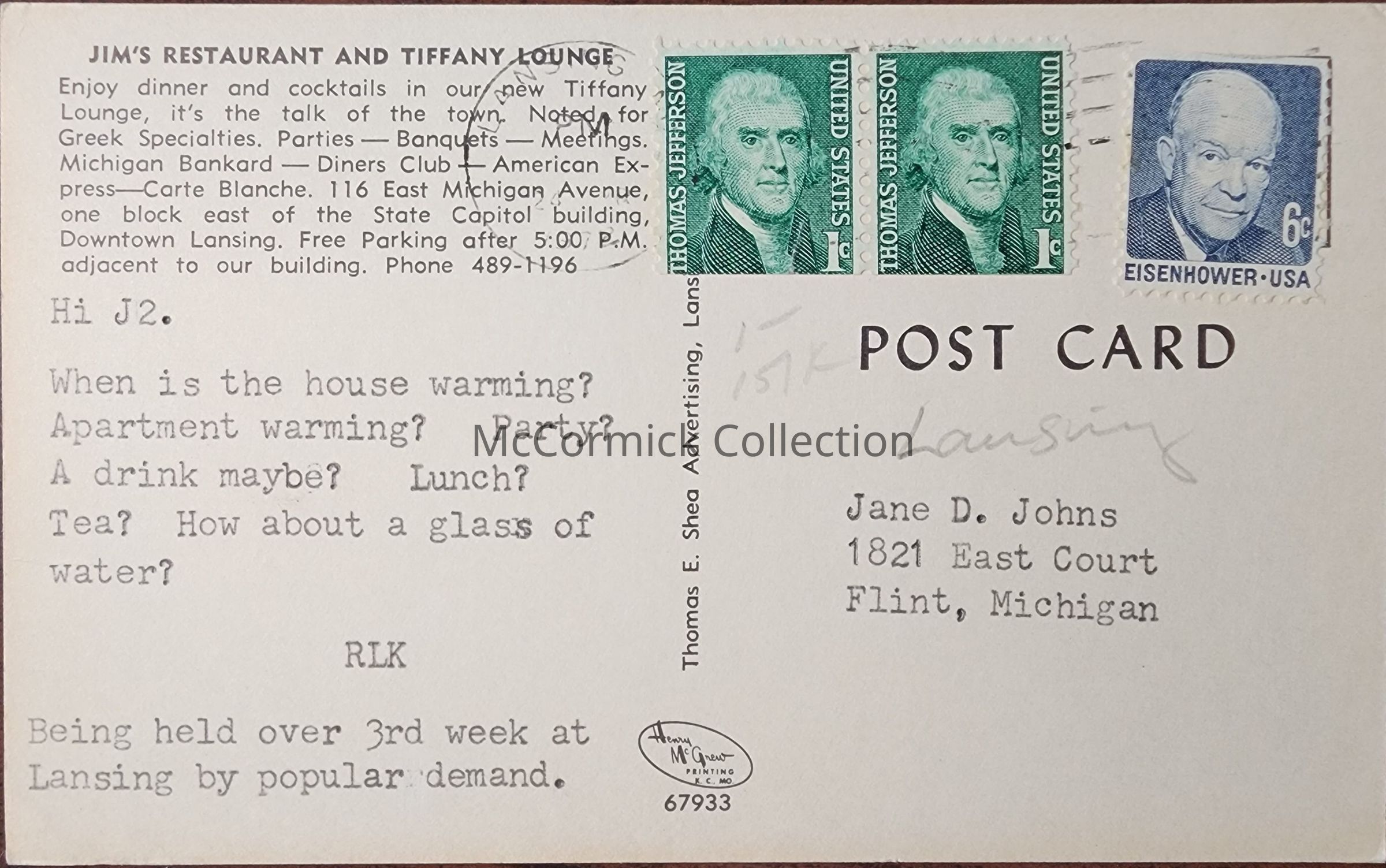 Jim's Restaurant and Tiffany Lounge Postcard