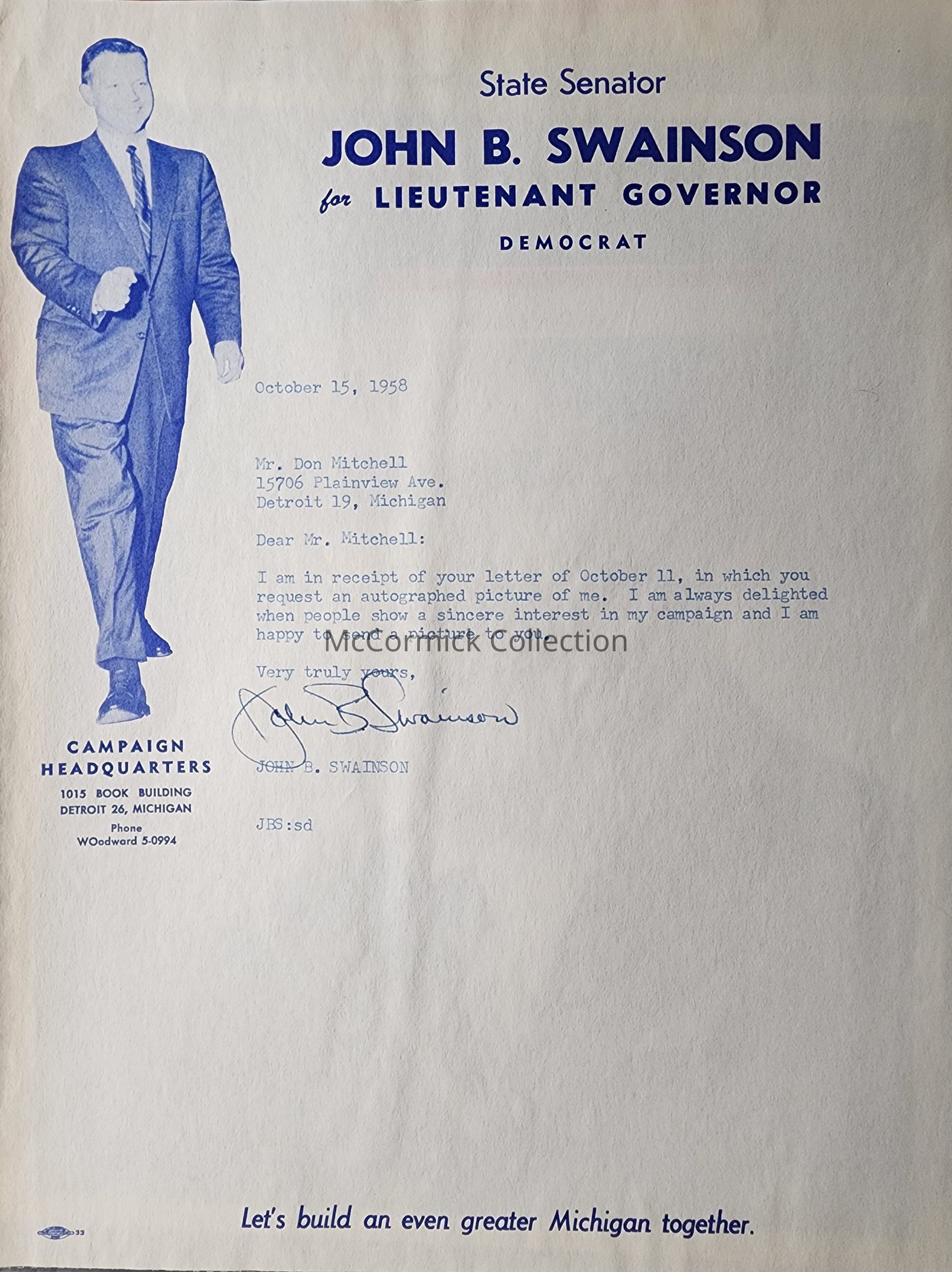 A 1958 letter on letterhead from the political campaign for State Senator John B. Swainson for Lieutenant Governor. Signed by Swainson. The letterhead features a picture of Swainson. Addressed to John Mitchell of Detroit.