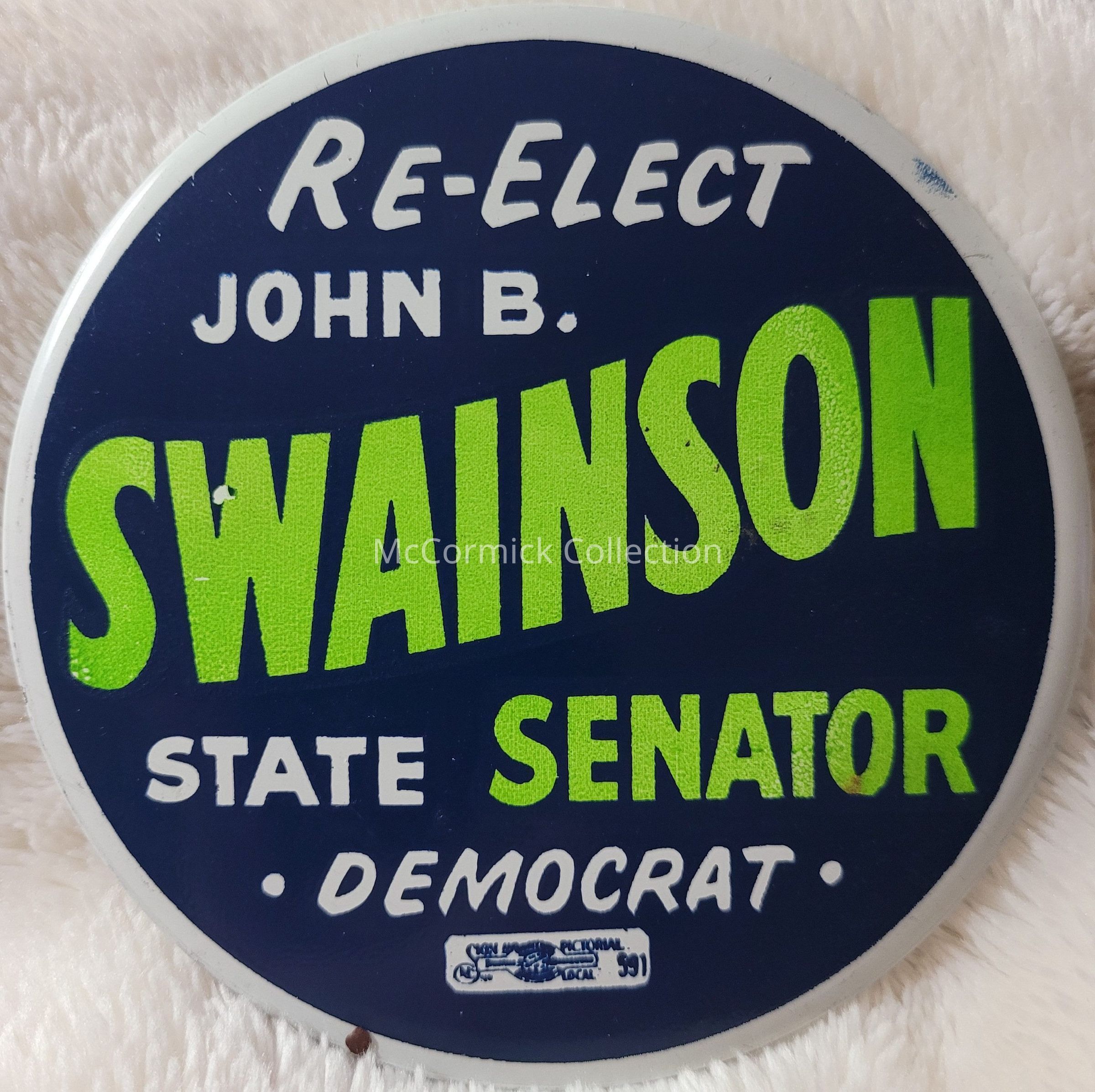 A 4" political button for John B. Swainson for State Senate, circa 1950s. Swainson later served as Governor of Michigan.