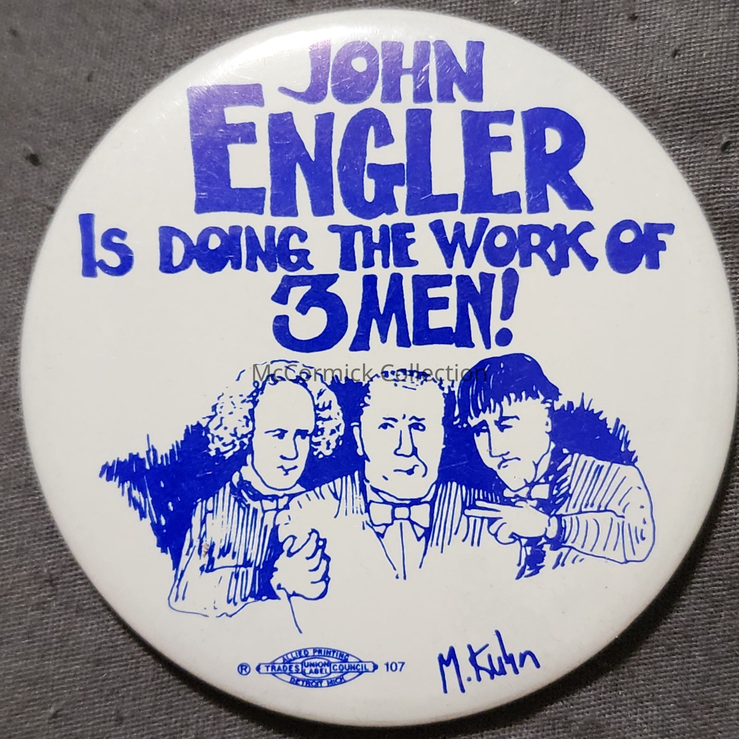 A 2.25" anti political button opposing John Engler for Governor, circa 1990s. Uses the Three Stooges as a reference for the slogan "John Engler is doing the work of 3 men!"