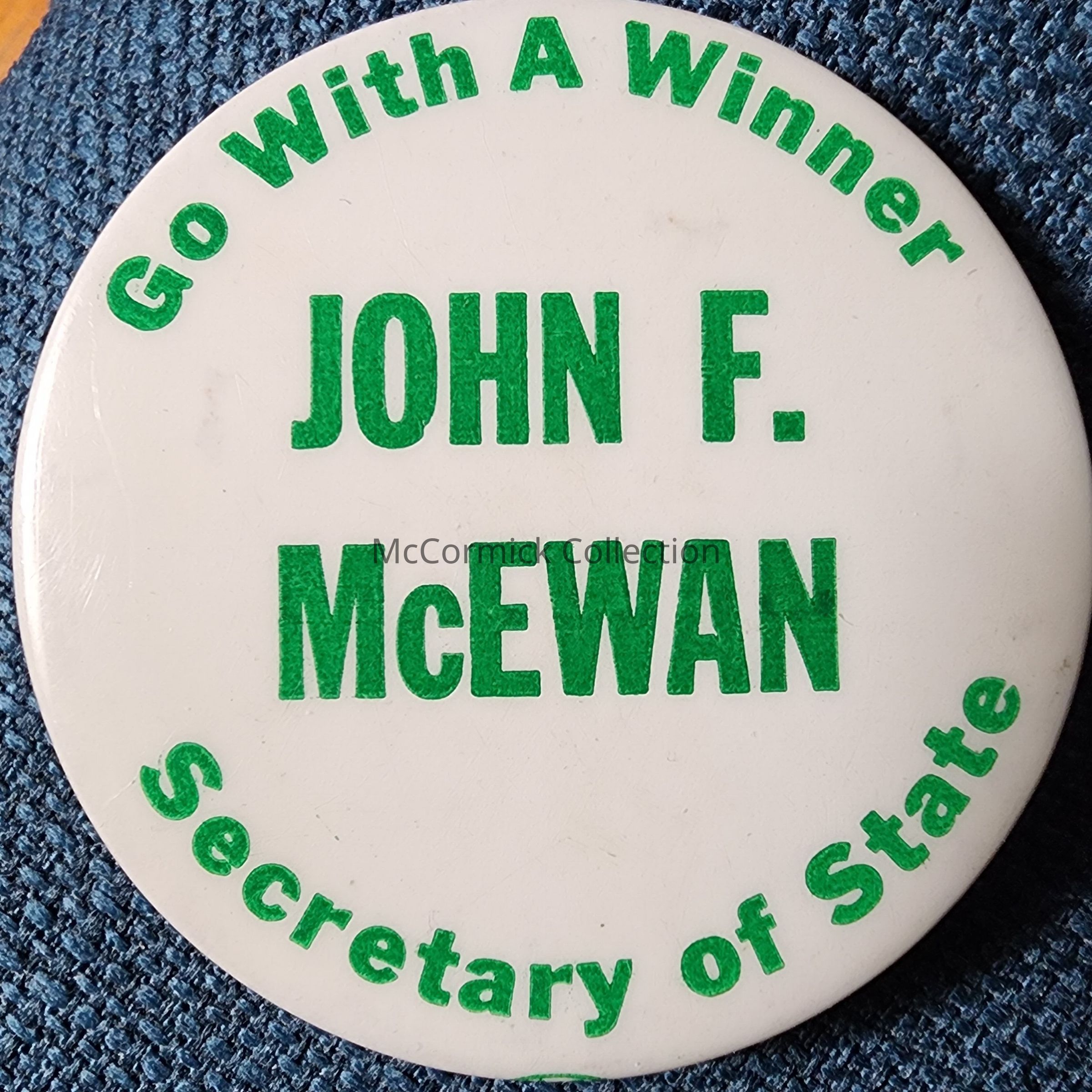 A 2.25" green and white political button for John F. McEwan for Michigan Secretary of State, "Go With a Winner" slogan. Did not win, longtime Mayor of River Rouge.