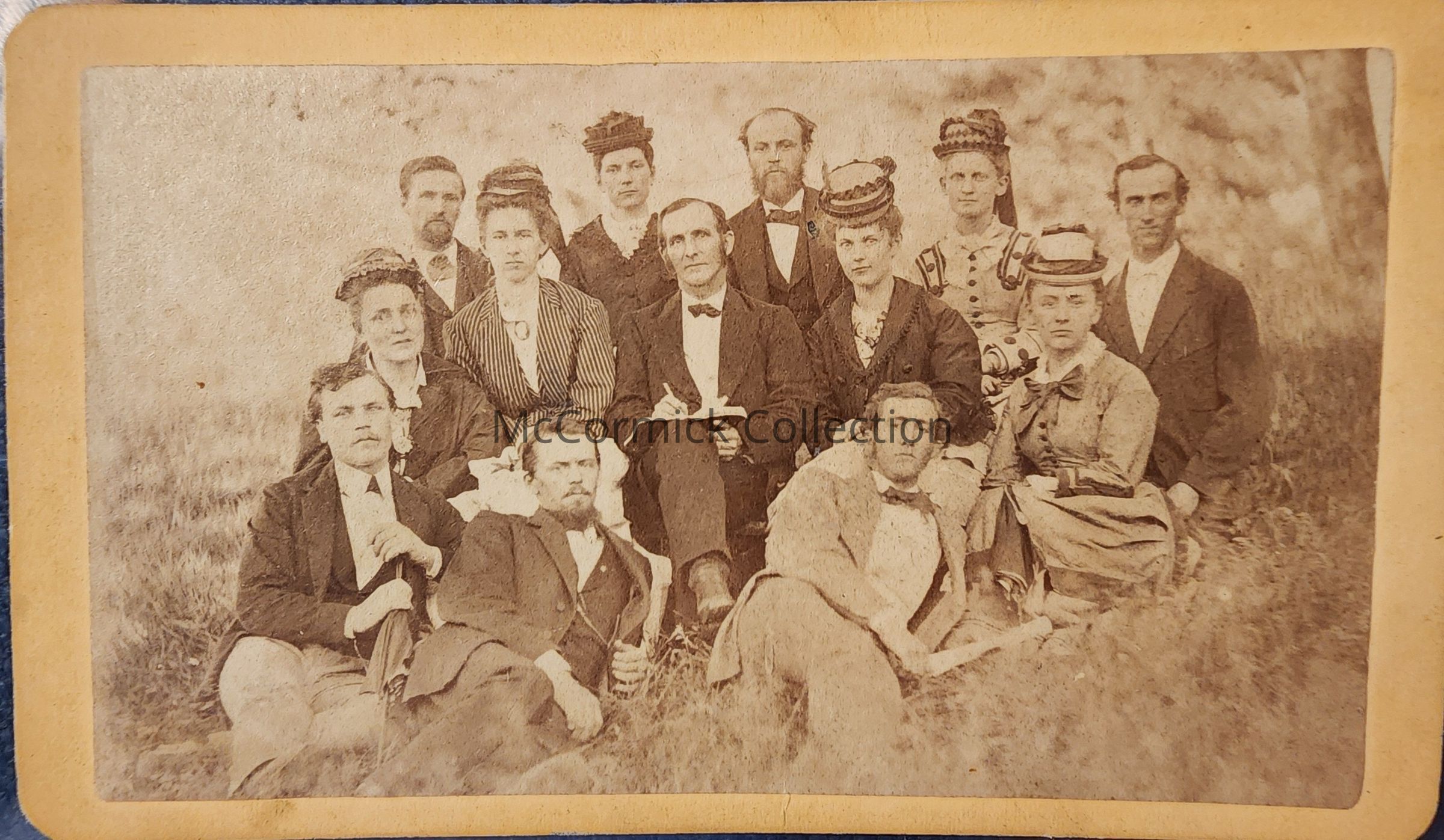 Carte de visite photograph of a group of people laying on a hill outside. Pictured is John H. Chase, laying in front middle. Believed to be a group of students at the University of Michigan in Ann Arbor.