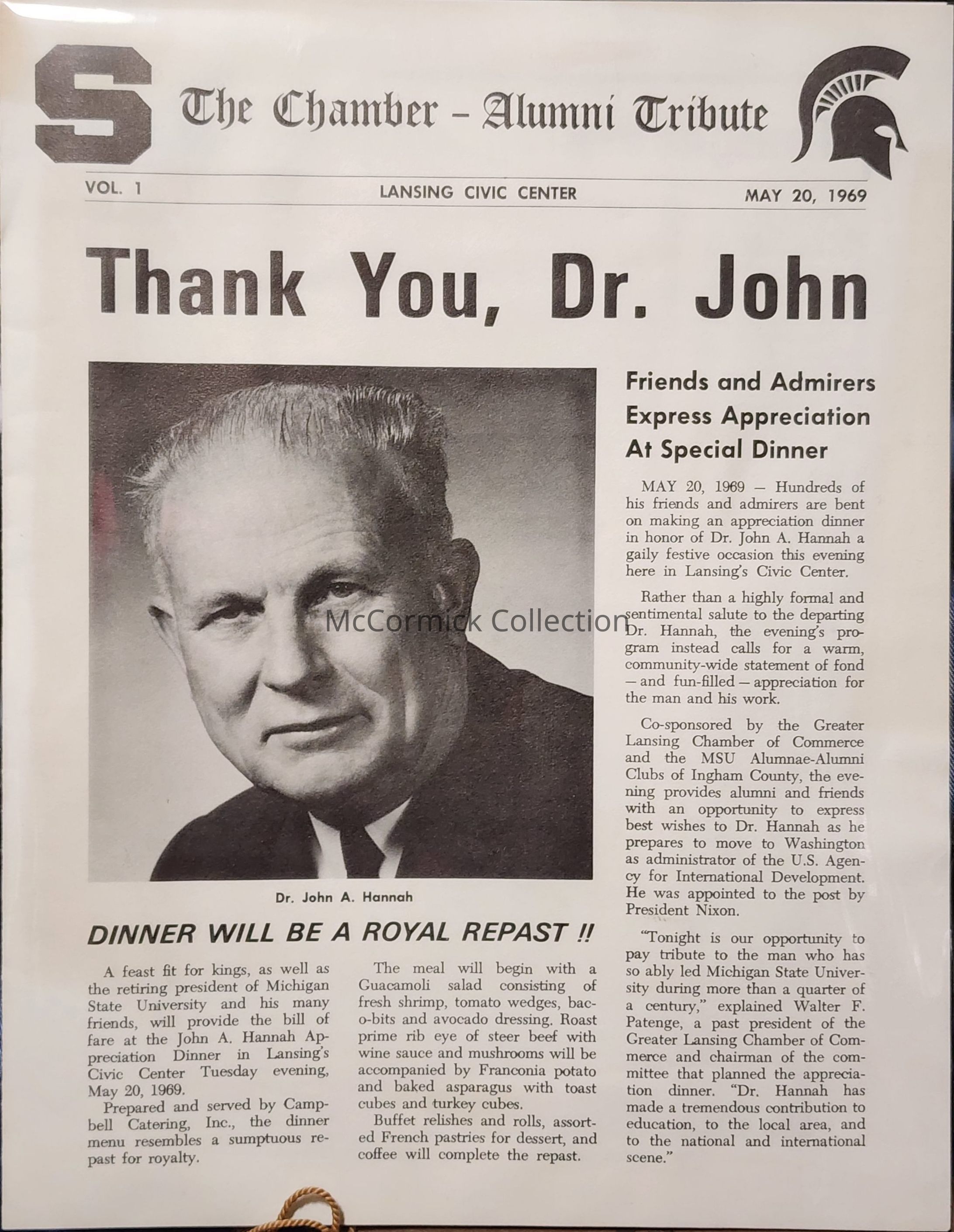 The 1969 retirement dinner of MSU President John A. Hannah at the Lansing Civic Center. A newspaper-like Pamphlet. From the Duane Vernon Collection.