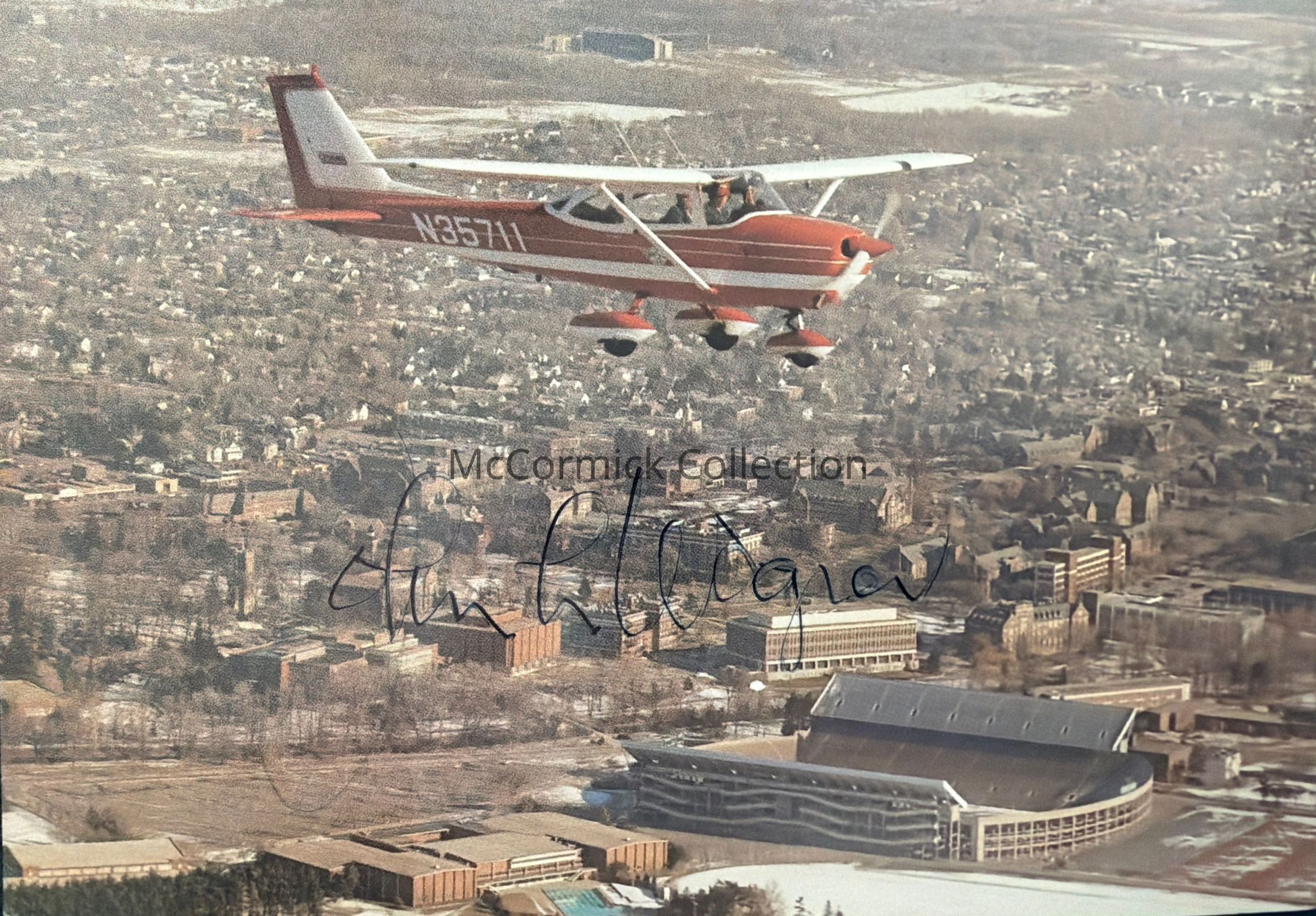 Postcard of John L. Wagner, aerial photographer, in his Cessna flying over East Lansing, Michigan State University. Signed by Wagner.