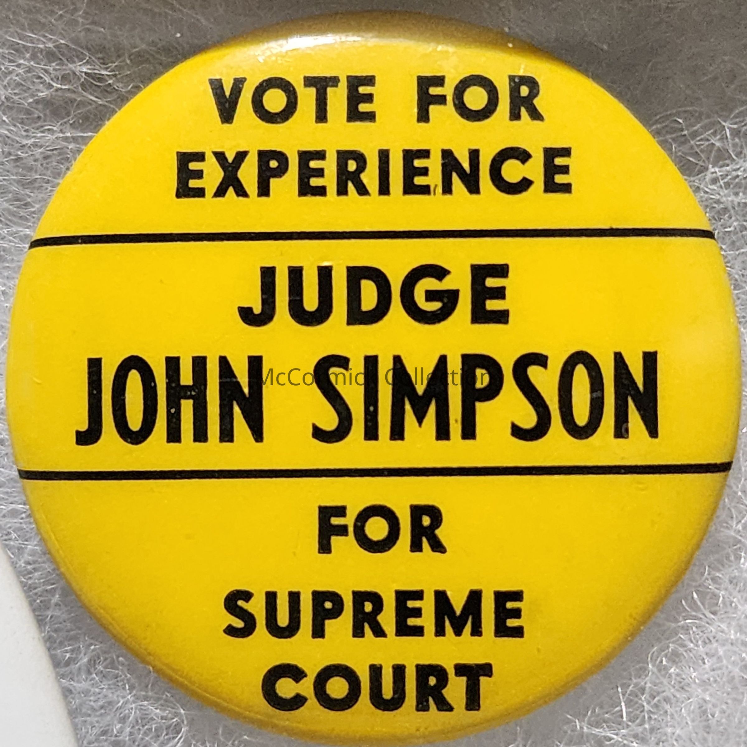 A 1.25" black and yellow political button for Judge John Simpson for Michigan Supreme Court.