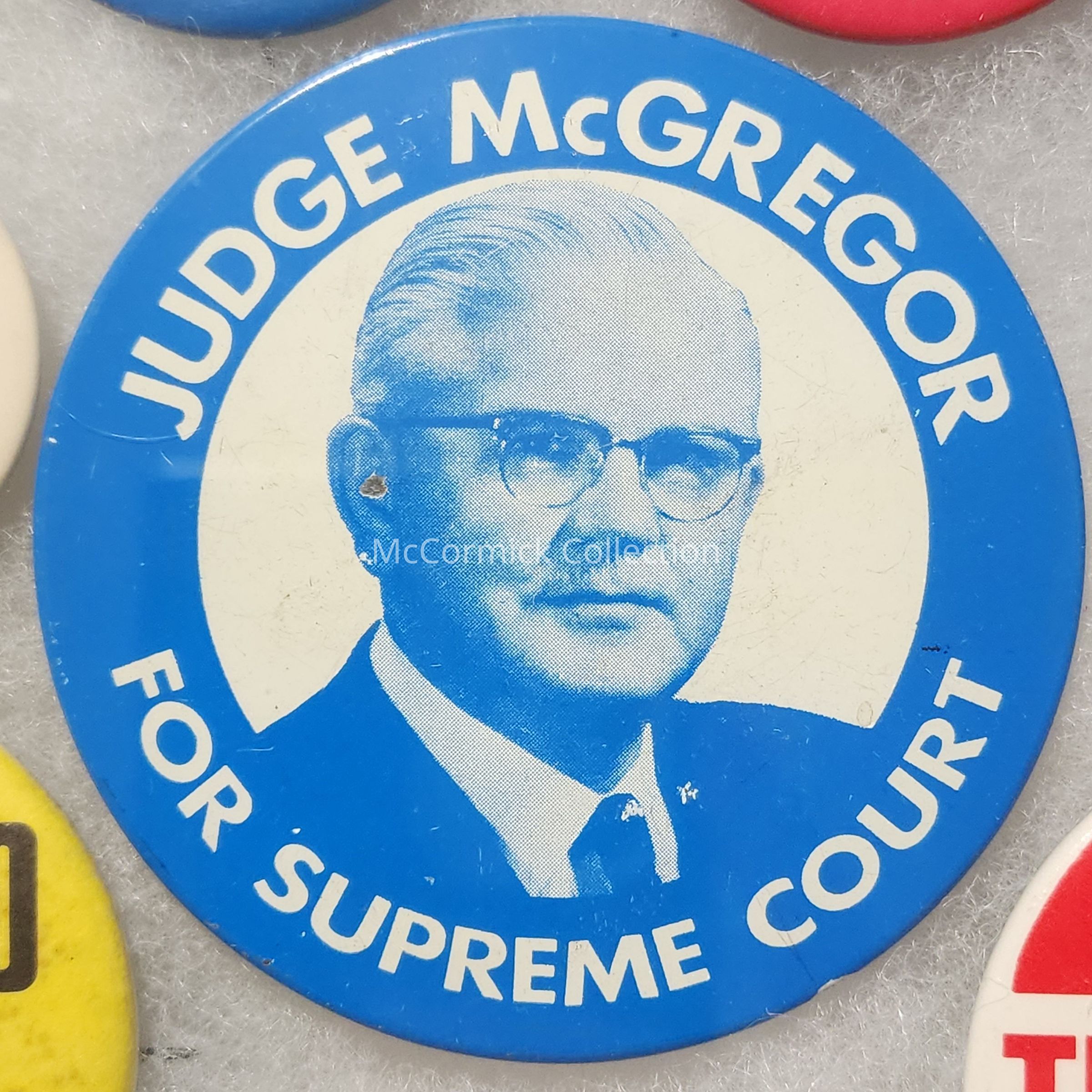 A 3" Blue and white political picture button for Judge McGregor for Michigan Supreme Court Justice.