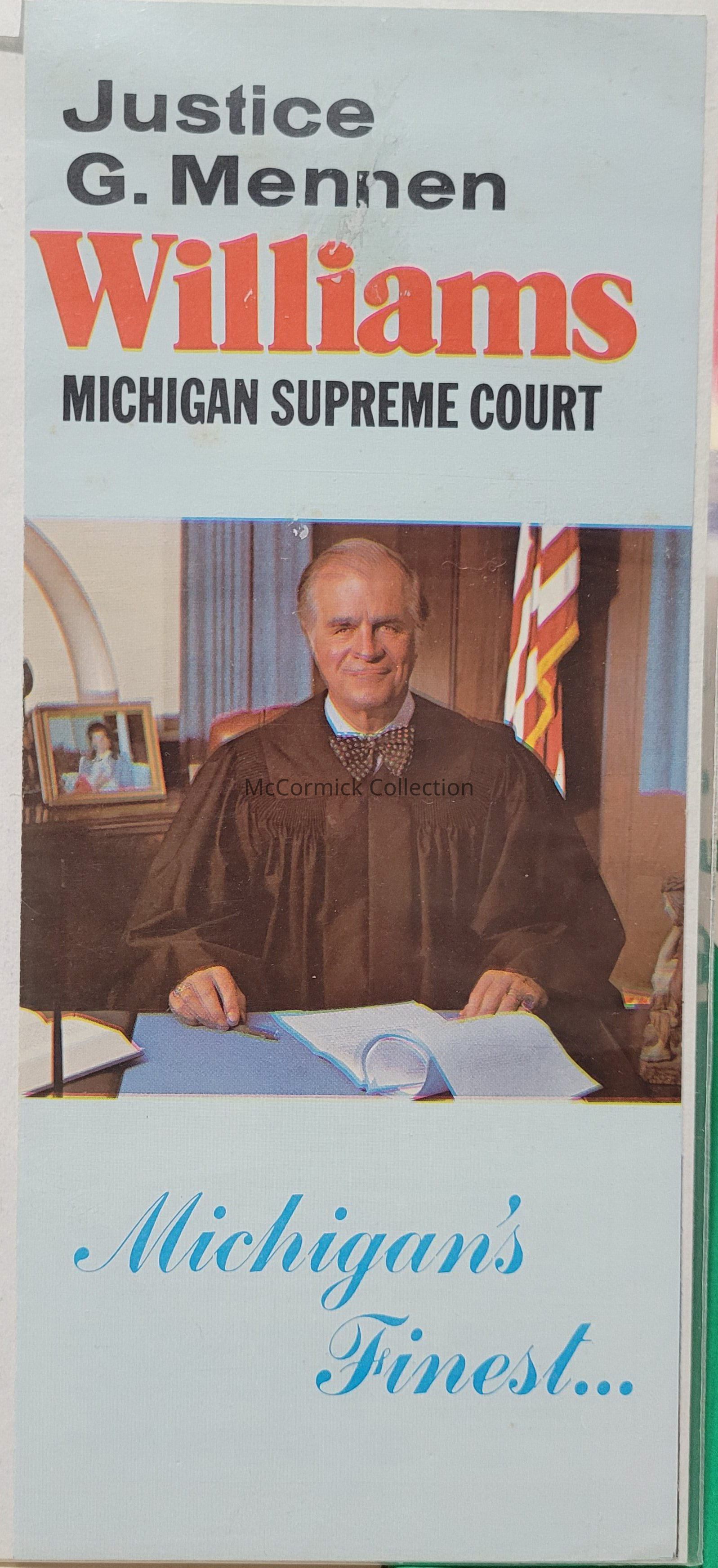A 1978 pamphlet from the campaign of Justice G. Mennen Williams for Michigan Supreme Court Justice.