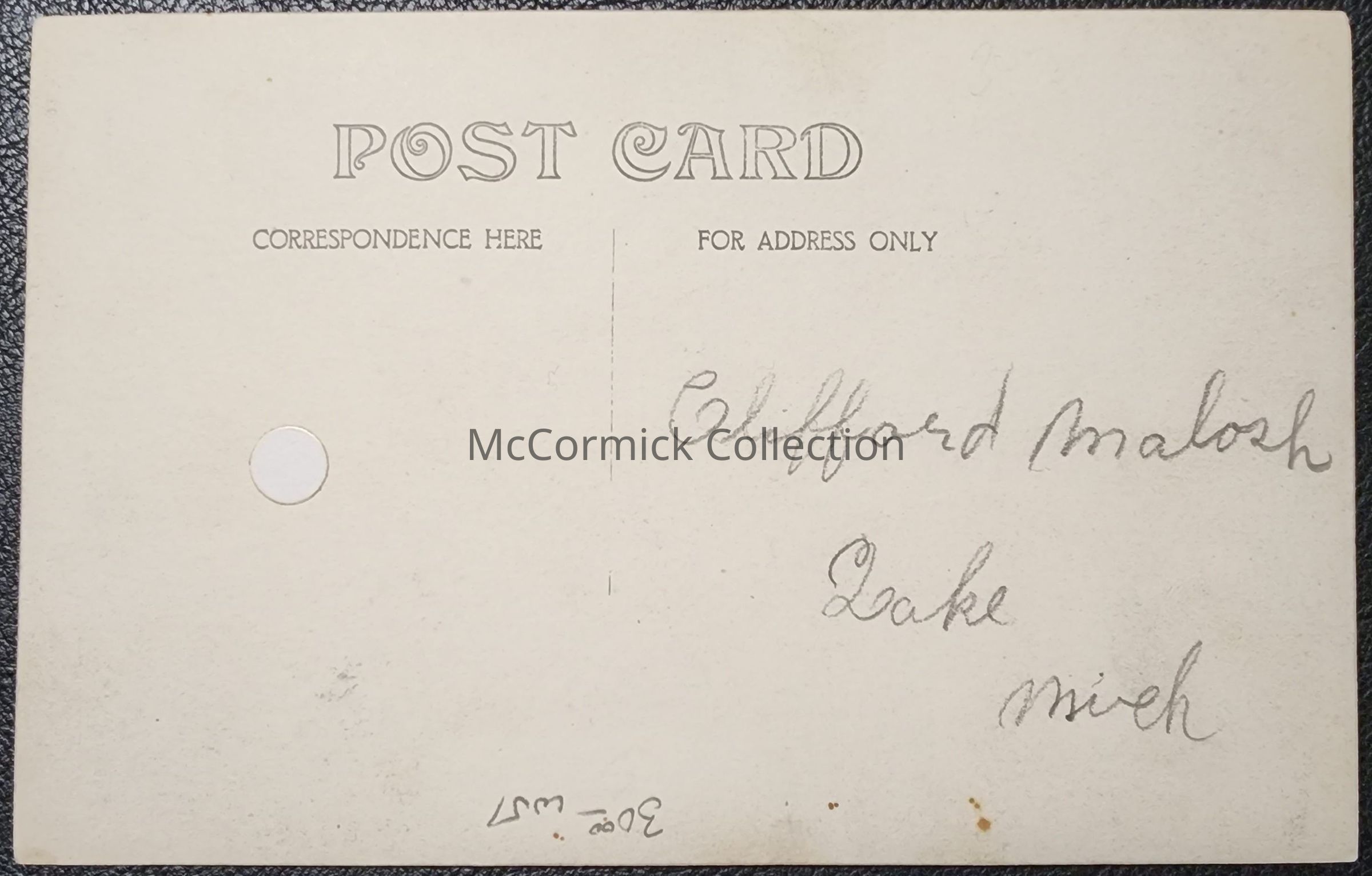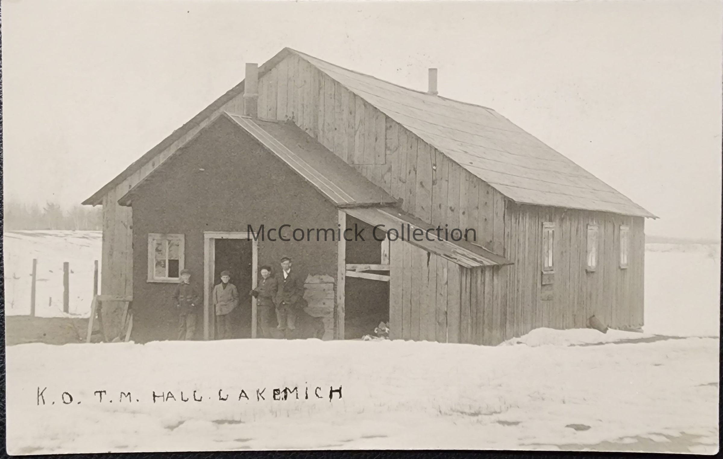 Real photo postcard of the K.O.T.M. Hall in Lake, Michigan. Shows an old wood building. Postslly unused. Addressed to Clifford Malosh, Lake, Mich.