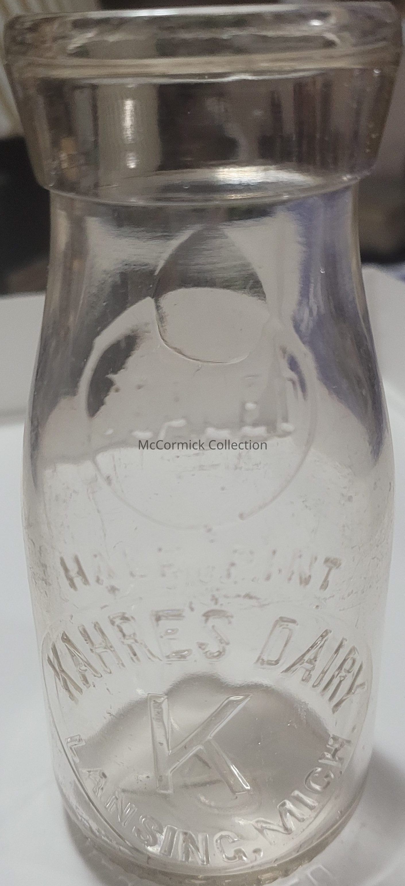 An embossed half pint bottle with slug plate from the Kahres Dairy Farm of Holt and Lansing, Michigan. Sealed logo.