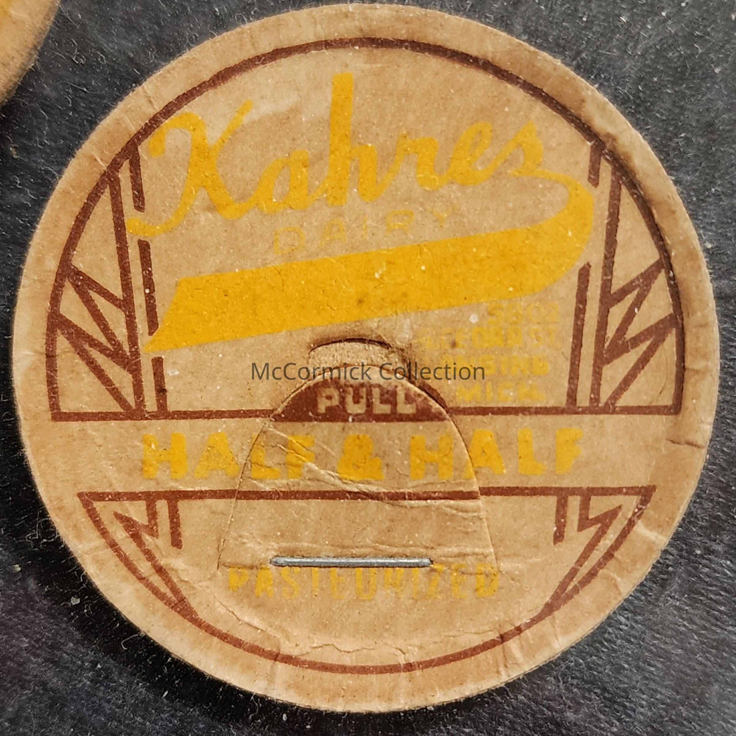 A paper bottle cap for half and half from the Kahres Dairy Farm of Holt and Lansing, Michigan.