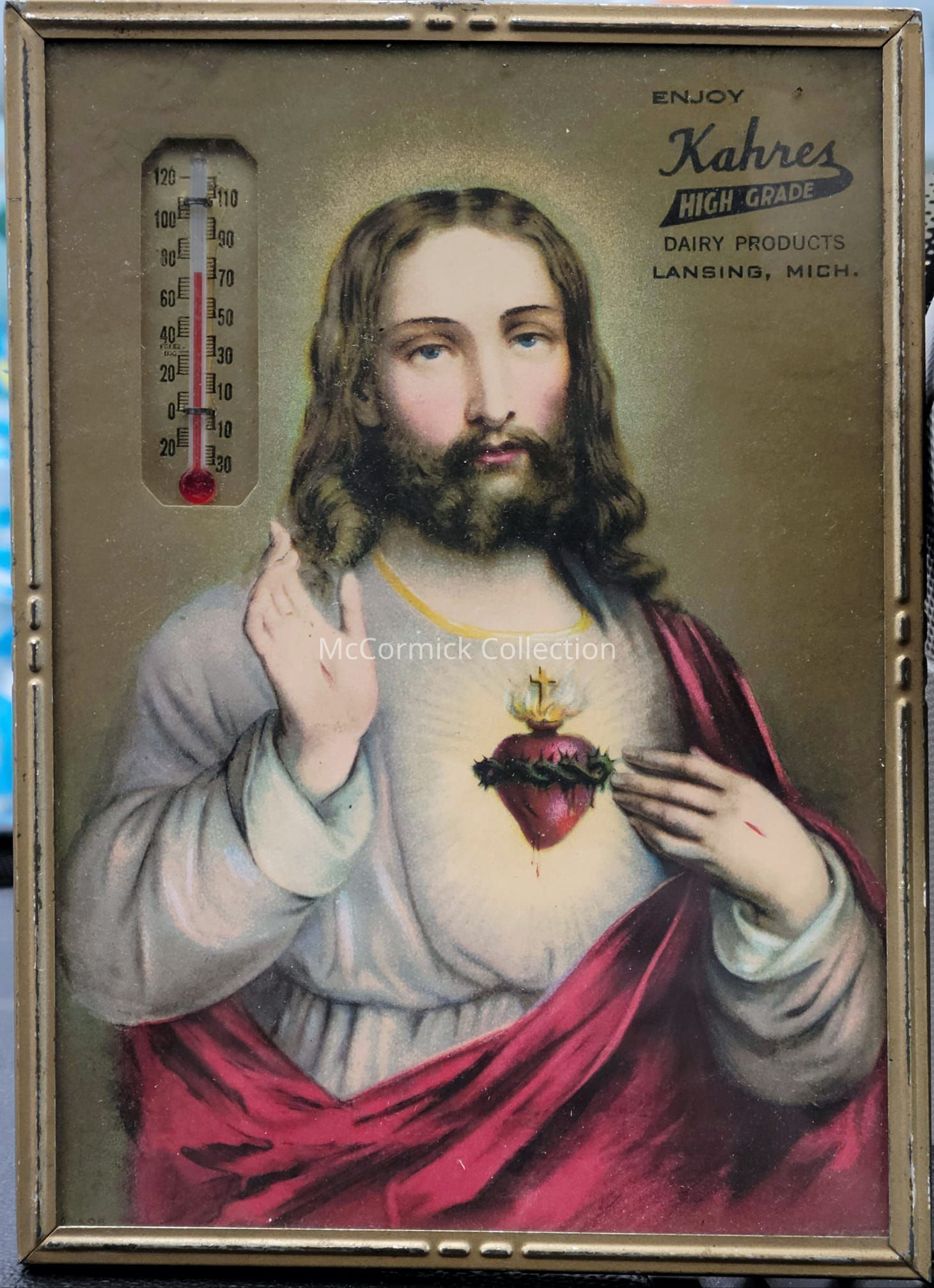 A circa 1940s advertising thermometer picture frame featuring Jesus from the Kahres Dairy Farm of Lansing and Holt, Michigan.