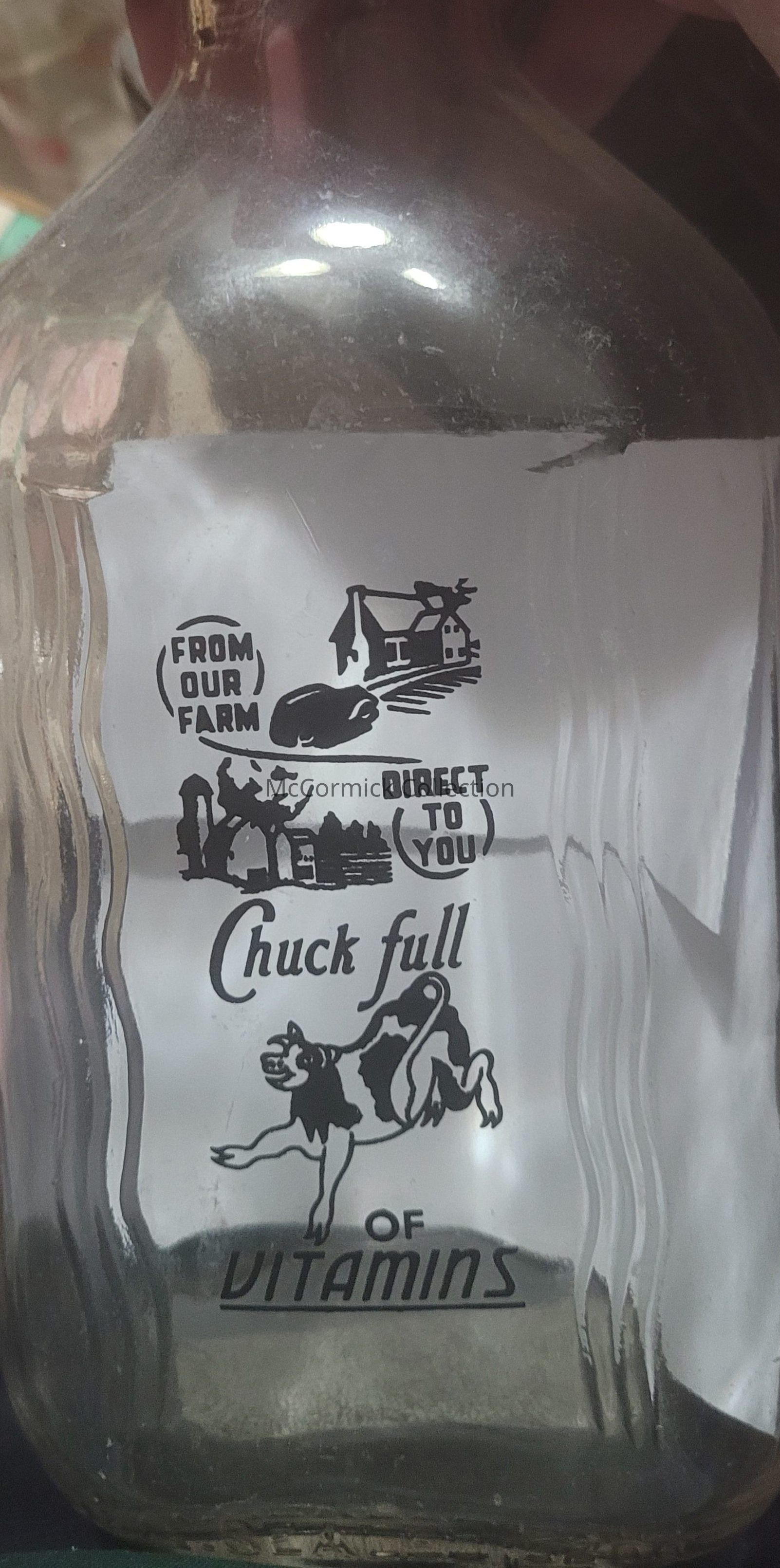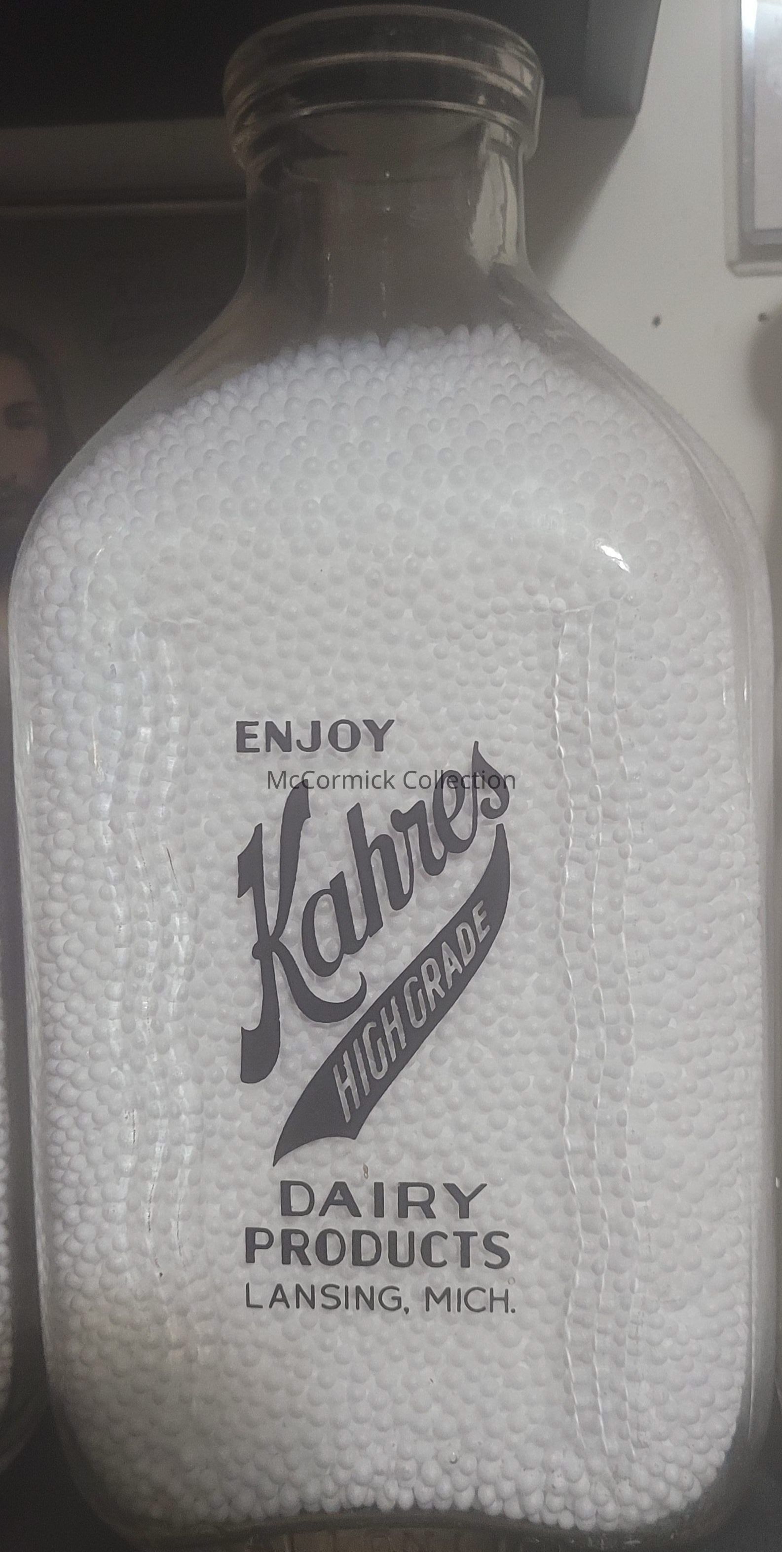 A half gallon bottle with black pyro from the Kahres Dairy Farm from Holt and Lansing, Michigan, with the black slogan of "From our Farm Direct to You / Chuck full of Vitamins."