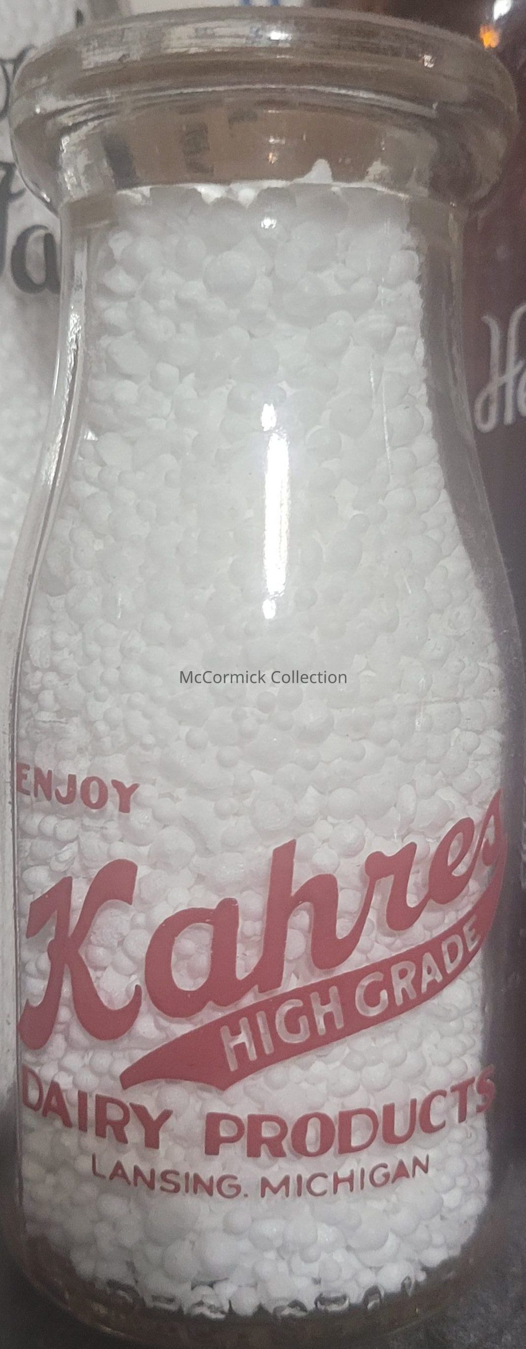 A half pint bottle with red pyro from the Kahres Dairy Farm of Holt and Lansing, Michigan.
