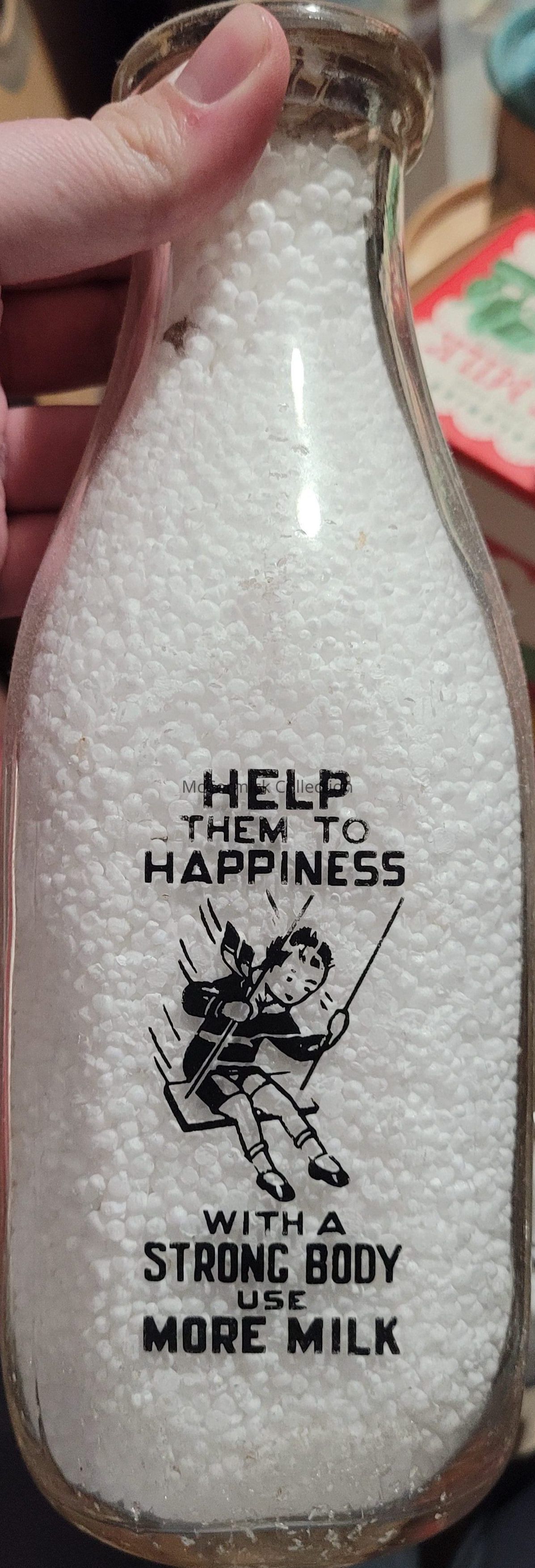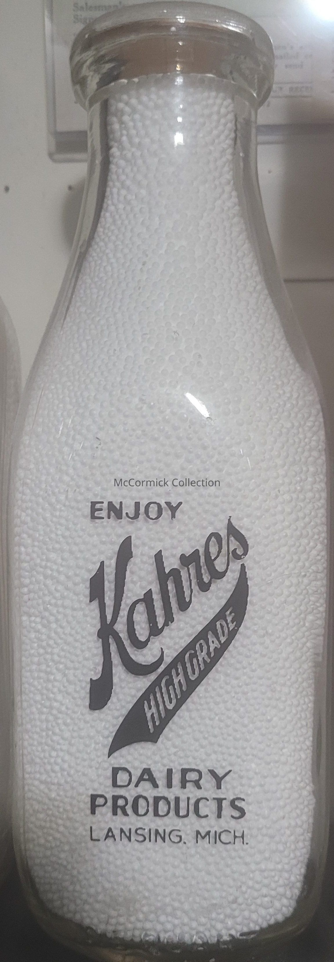 A square quart bottle with black pyro from the Kahres Dairy Farm of Holt and Lansing, Michigan. Includes the back slogan of "Help them to Happiness / With a Strong Body Use More Milk."