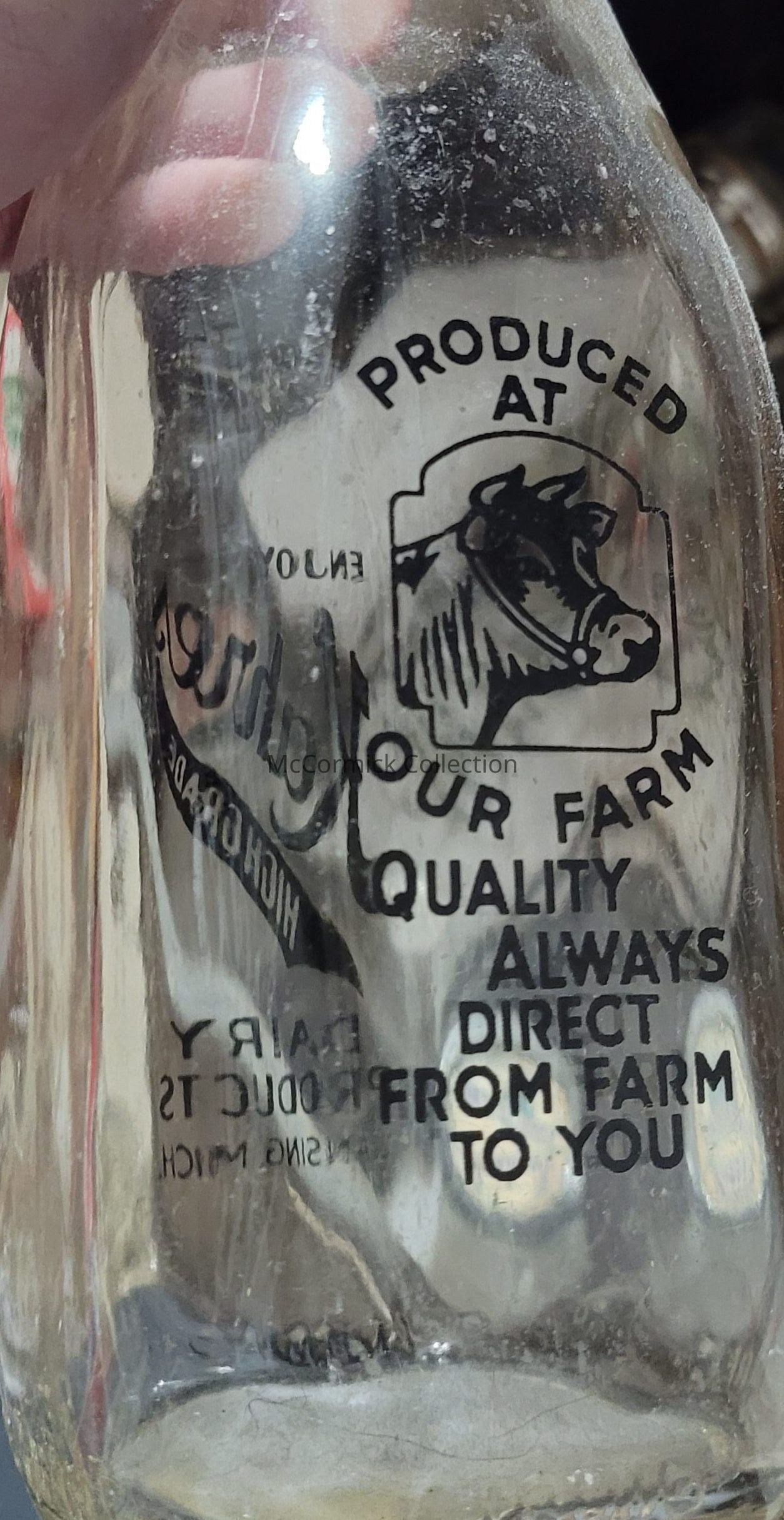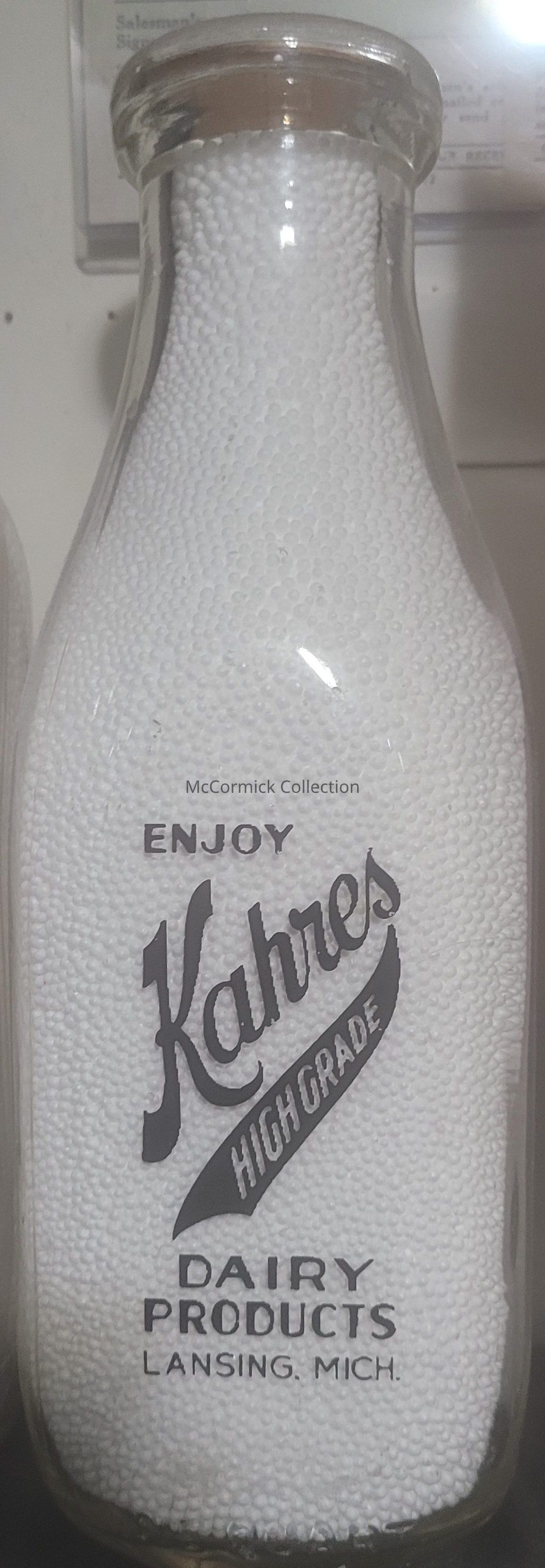 A square quart bottle with black pyro from the Kahres Dairy Farm of Holt and Lansing, Michigan. The back slogan is: "Produced at Our Farm / Quality Always Direct from Farm to You."