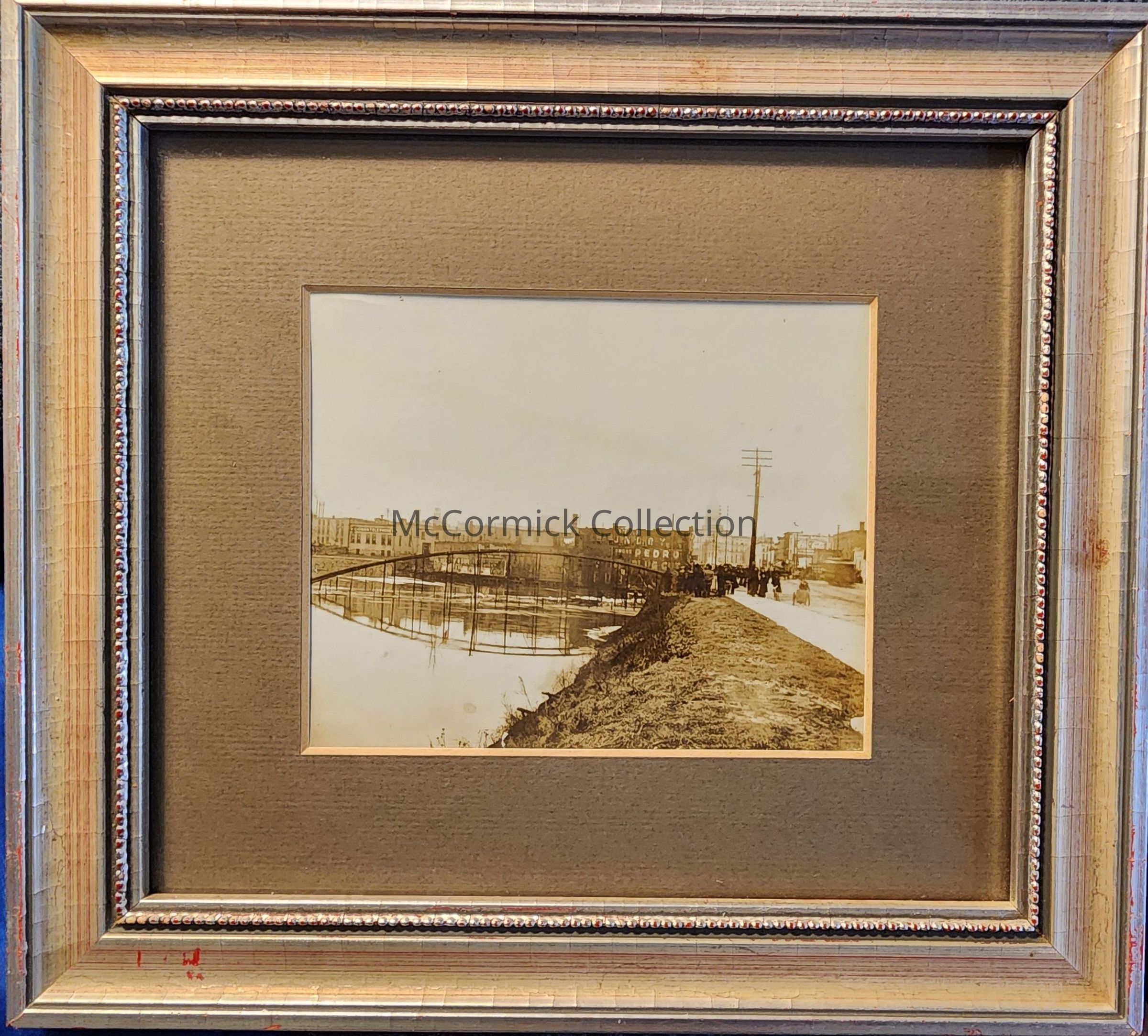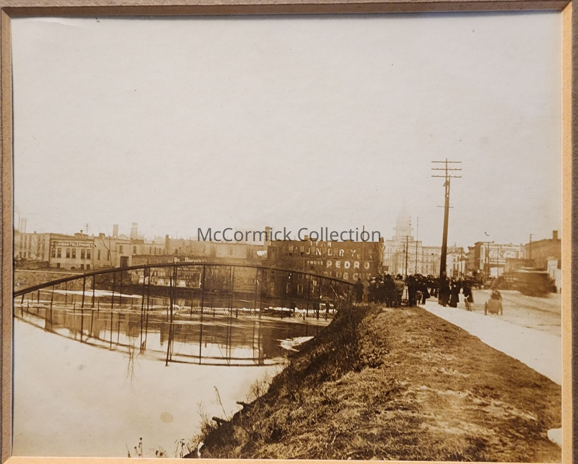 Framed photograph of the Kalamazoo Street Bridge during the Lansing flood of 1904. Shown in the photo are the Michigan State Capitol and other downtown advertising. Taken facing west after the Kalamazoo Bridge floated down river and stuck on the Michigan Avenue Bridge.