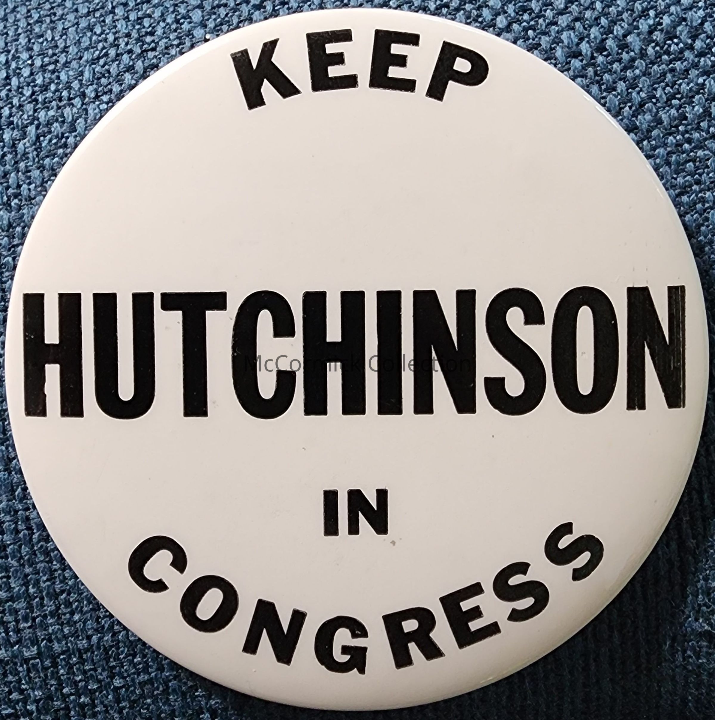Political button from a campaign of Congressman Edward Hutchinson of Michigan. Hutchinson was a delegate to the 1961-62 Michigan Constitutional Convention (Con Con). Circa 1970s.