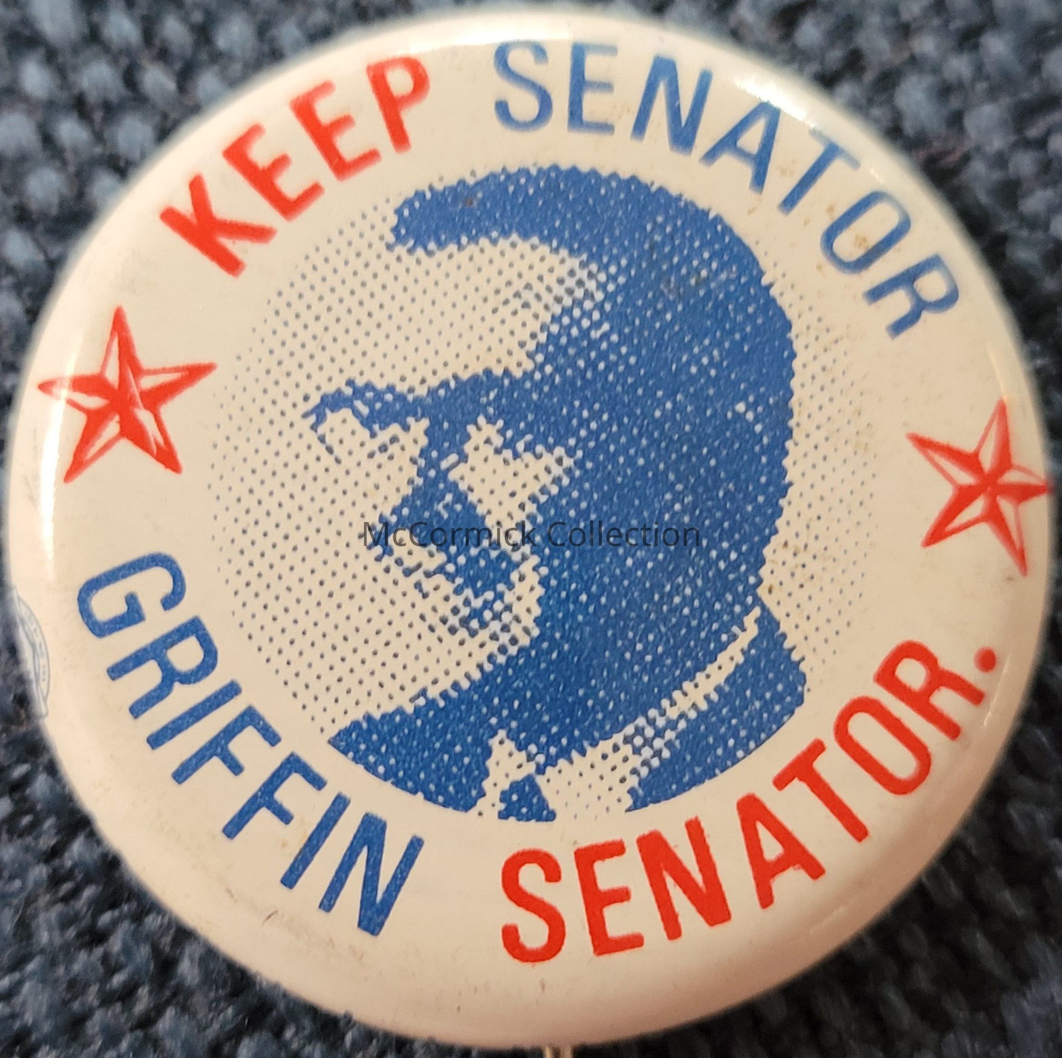 A 1.25" red, white, and blue political button for Robert Griffin for United States Senator.