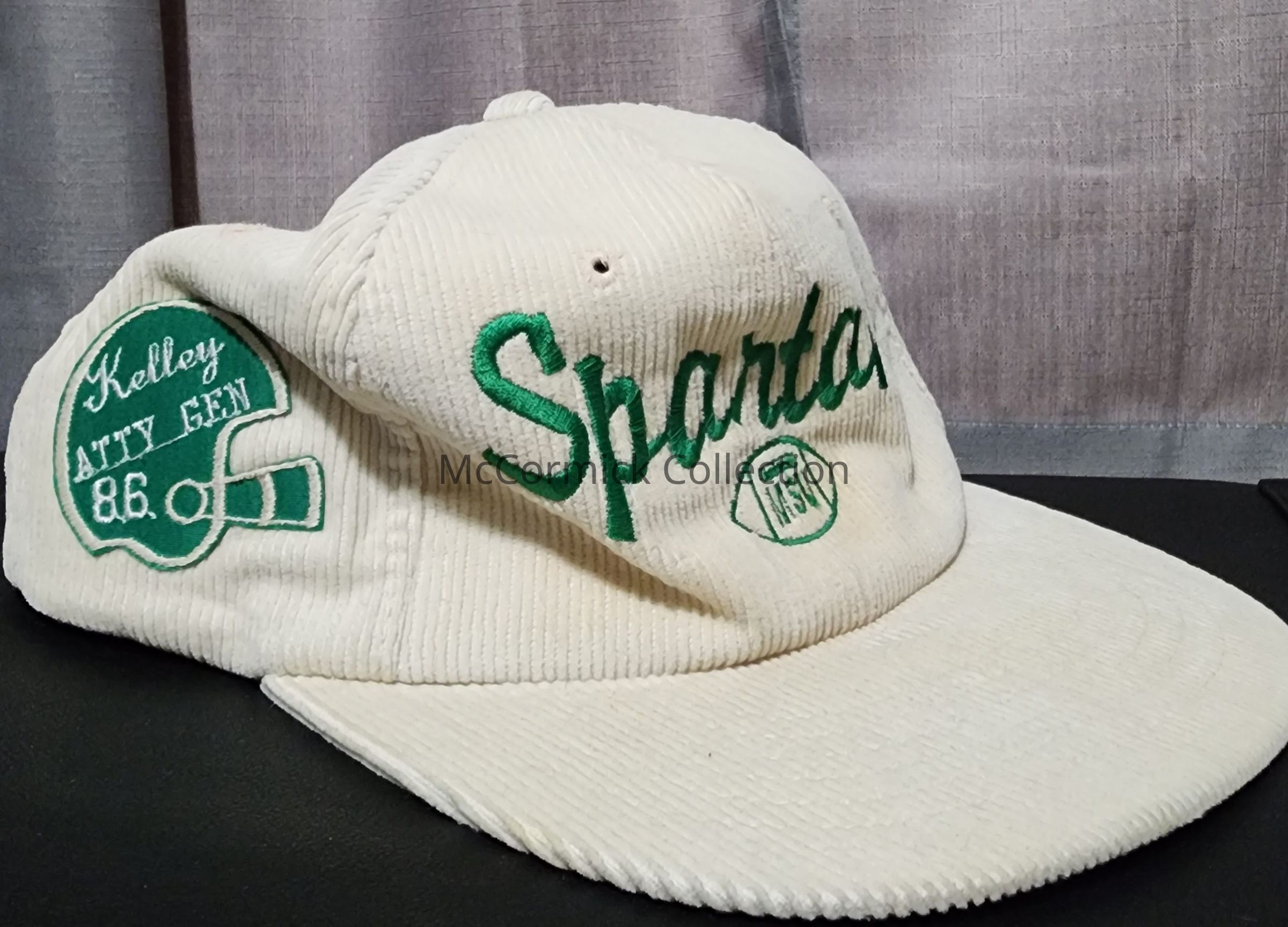 Michigan State Spartans hat with special helmet shaped patch on the side reading: "Kelley Atty Gen 86." From the estate of Frank J. Kelley, longtime Michigan Attorney General.