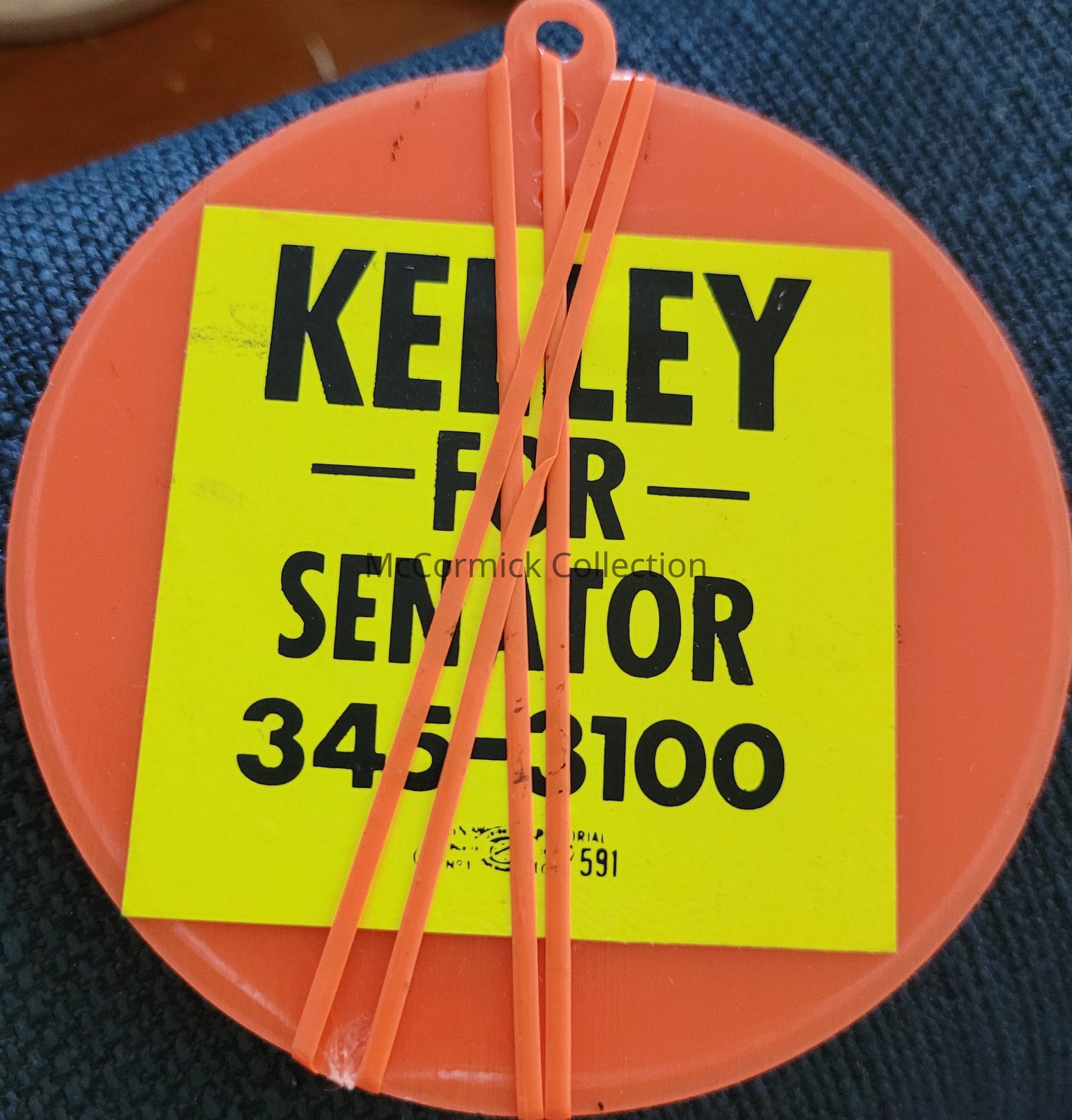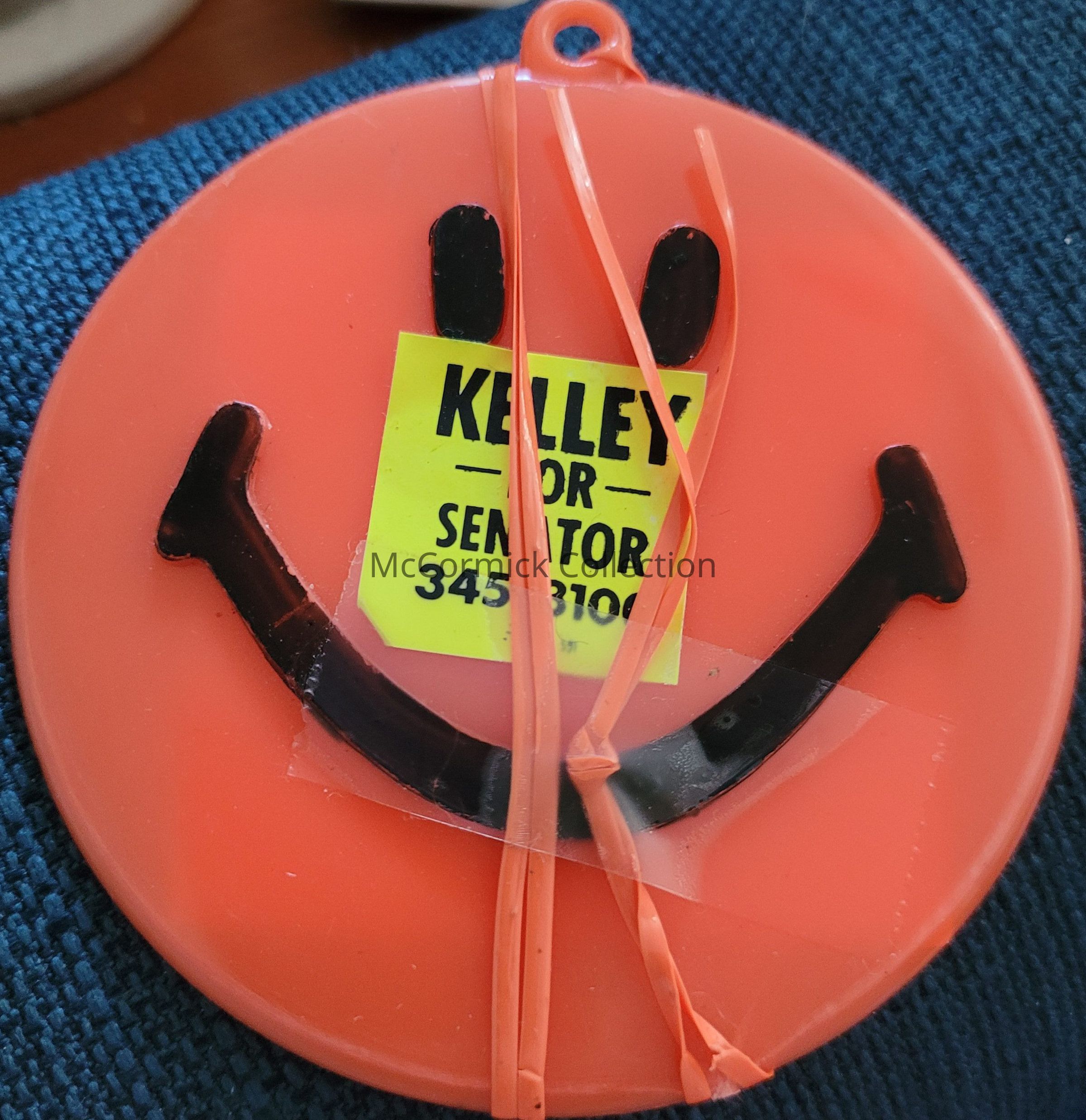 Orange smiley face balloon weight with yellow stickers for the campaign of Kelley for Senator.