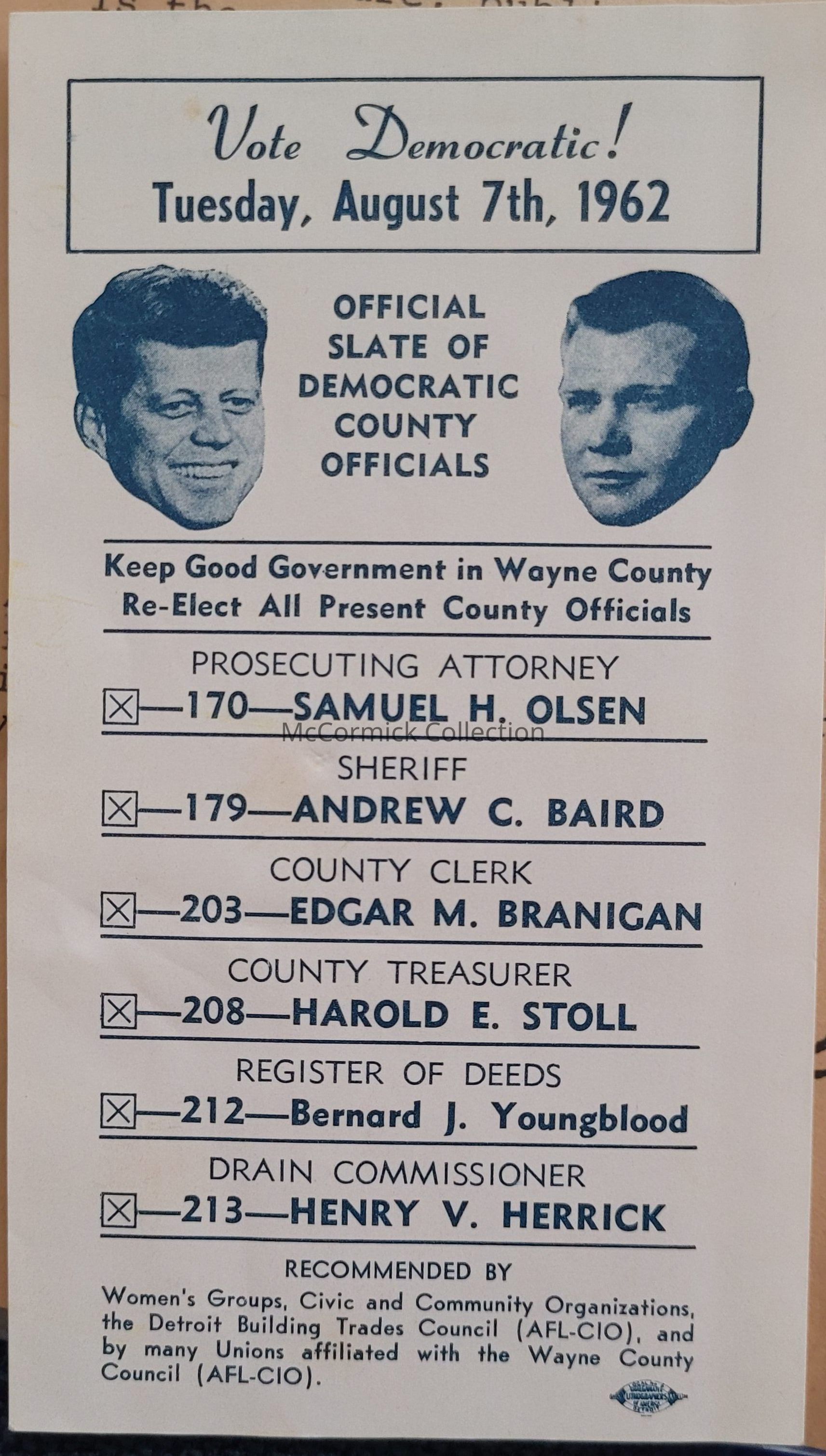 A coattail paper flier for John F. Kennedy for President and John B. Swainson for Governor and Wayne County local offices listed in 1962.