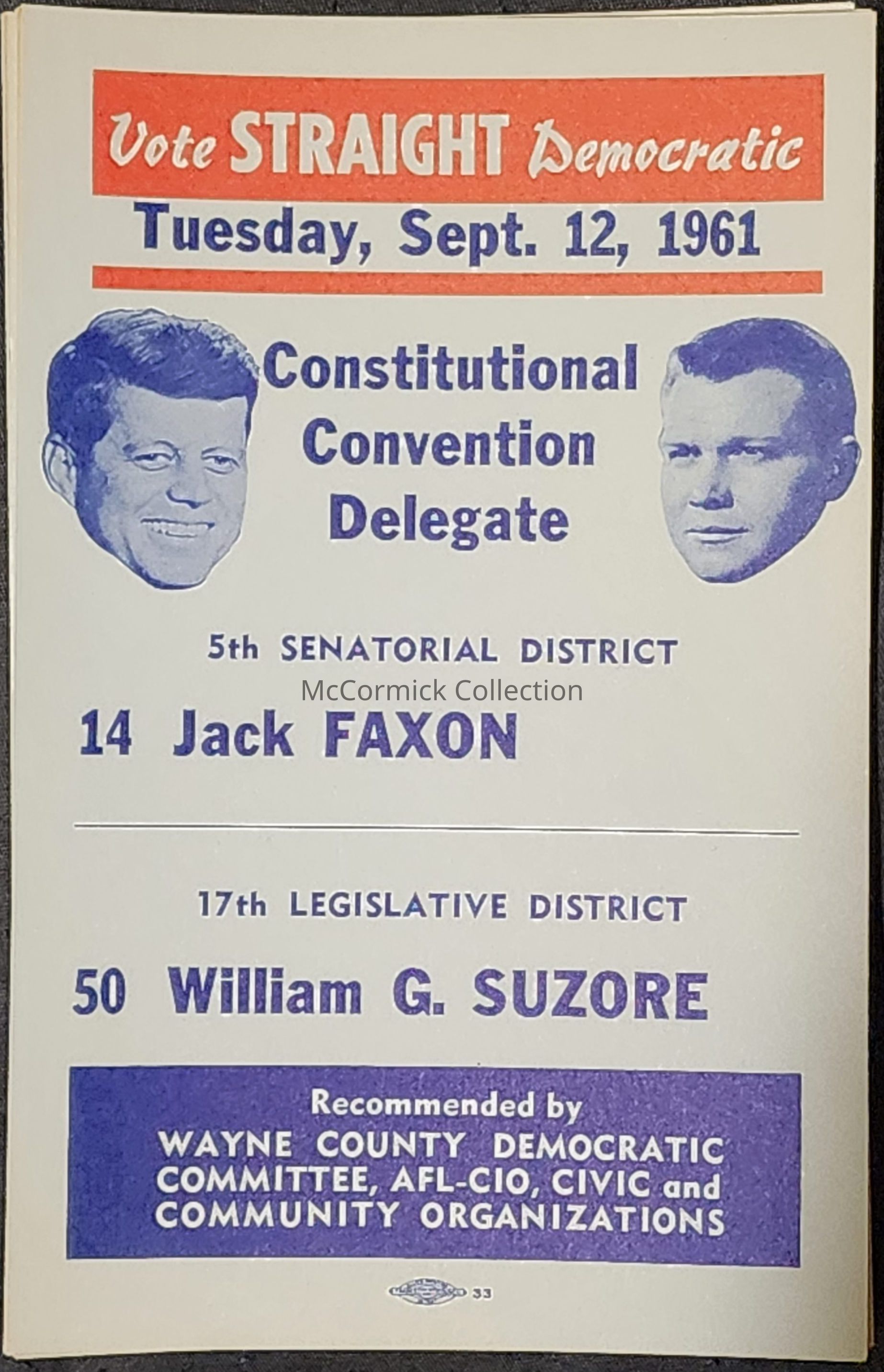 A small paper flier from 1961 featuring the likeness of John F. Kennedy and John B. Swainson. It campaigns for Jack Faxon and William Suzore for Constitutional Convention (Con Con) delegates.