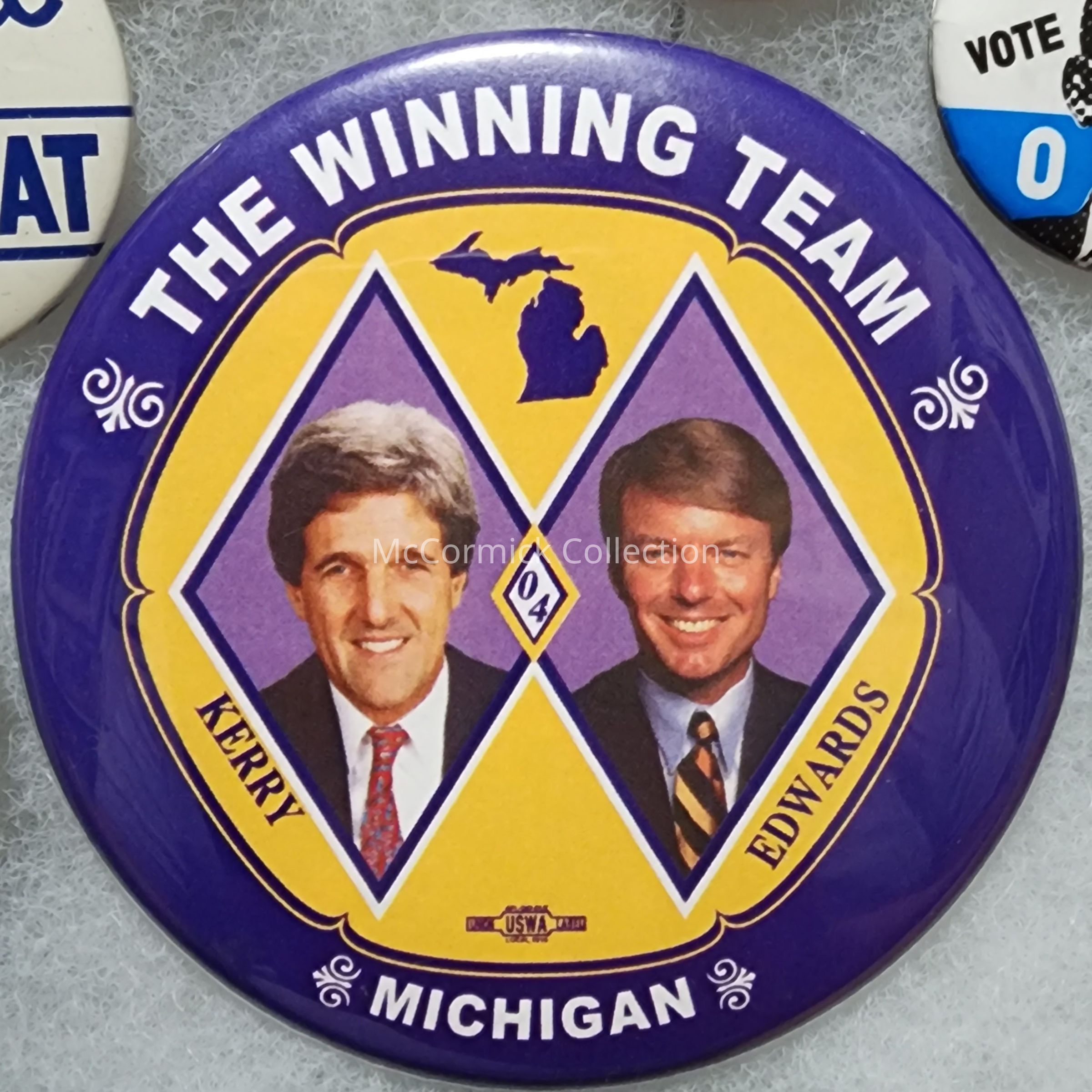 A 3" Color jugate political button for Michigan for John Kerry and John Edwards in 2004, with the "The Winning Team" slogan.