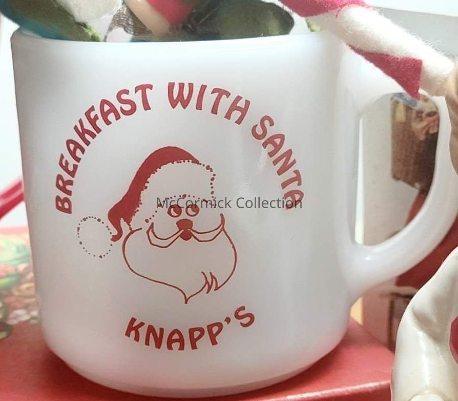 Fireking white mug with red print of a Santa face from Knapp's Department Store and their Breakfast with Santa.