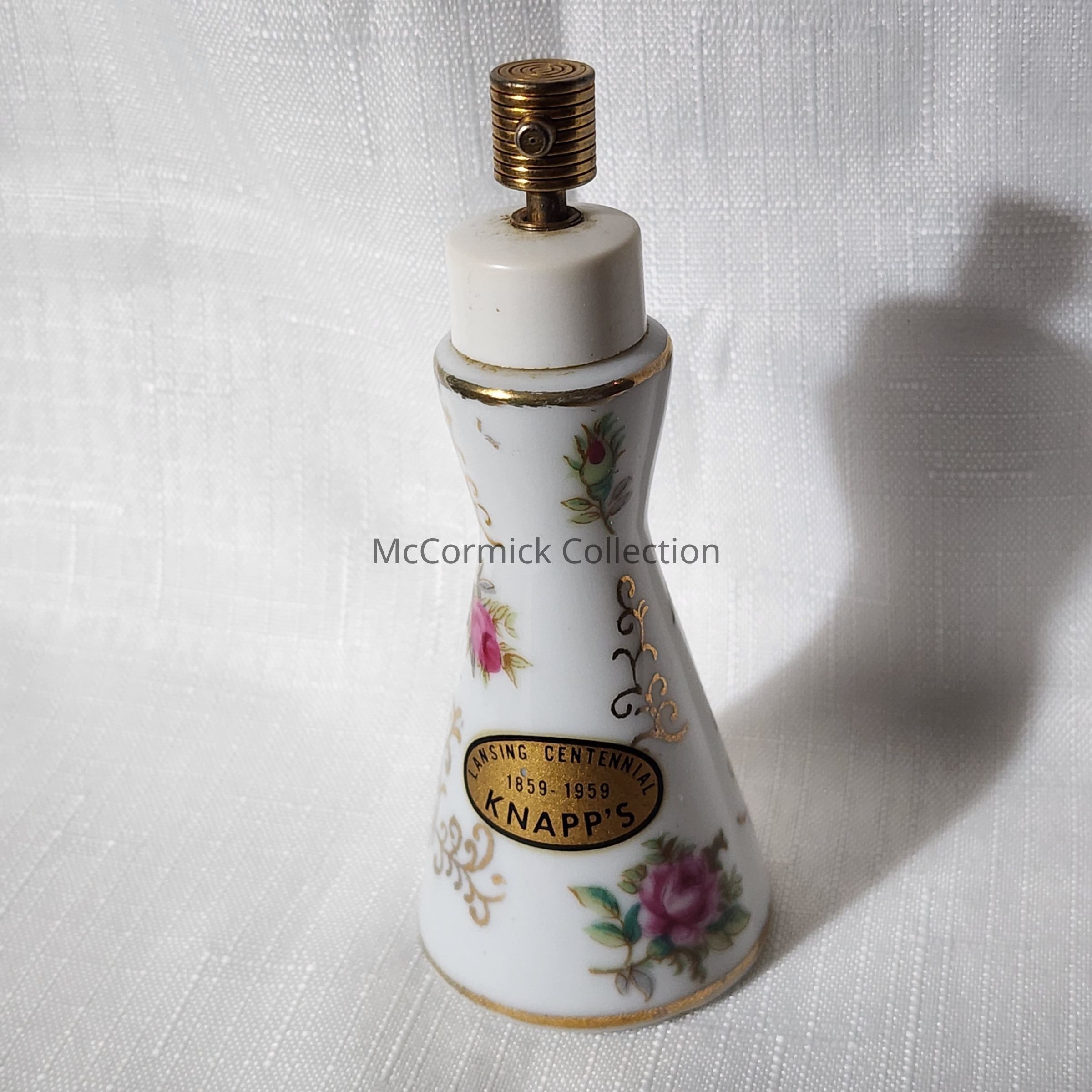 Ceramic perfume bottle in floral motif with a sticker reading "Lansing Centennial/1859-1959/Knapp's."