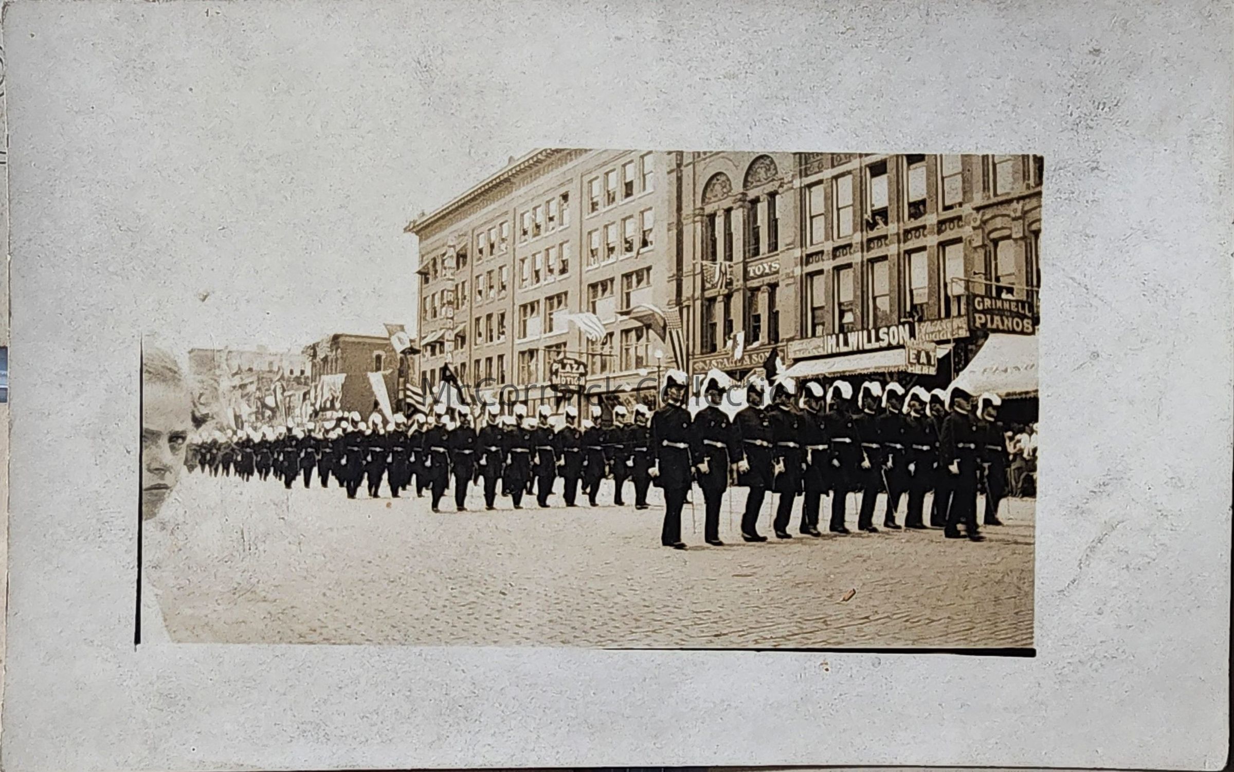 Real photo postcard of the Knight Templar Parade in Lansing, showing in the background Grinnell Bros., H.L. Willson, and Dancer-Brogan in the Tussing Building. Taken at street level with a Child on the left foreground.