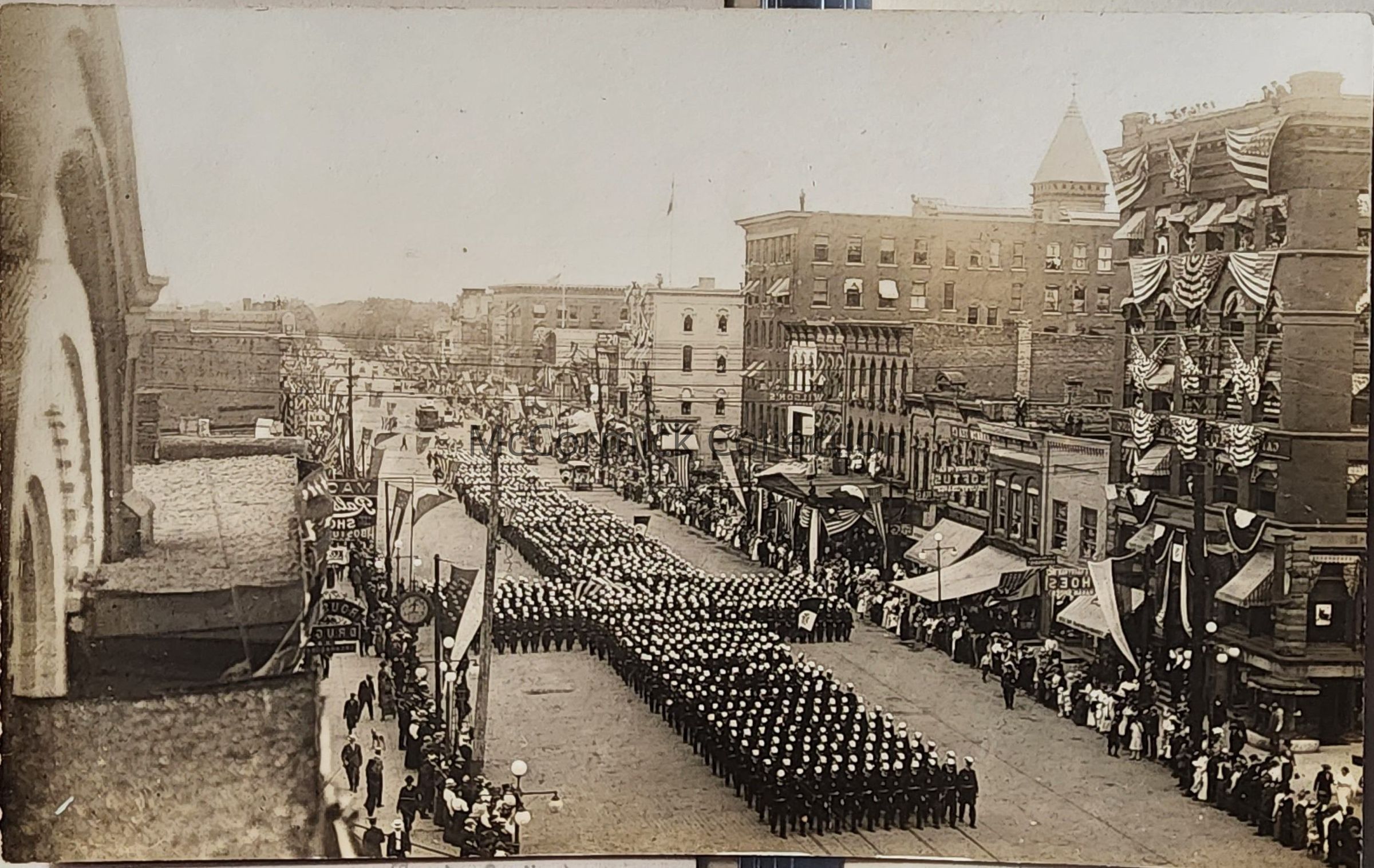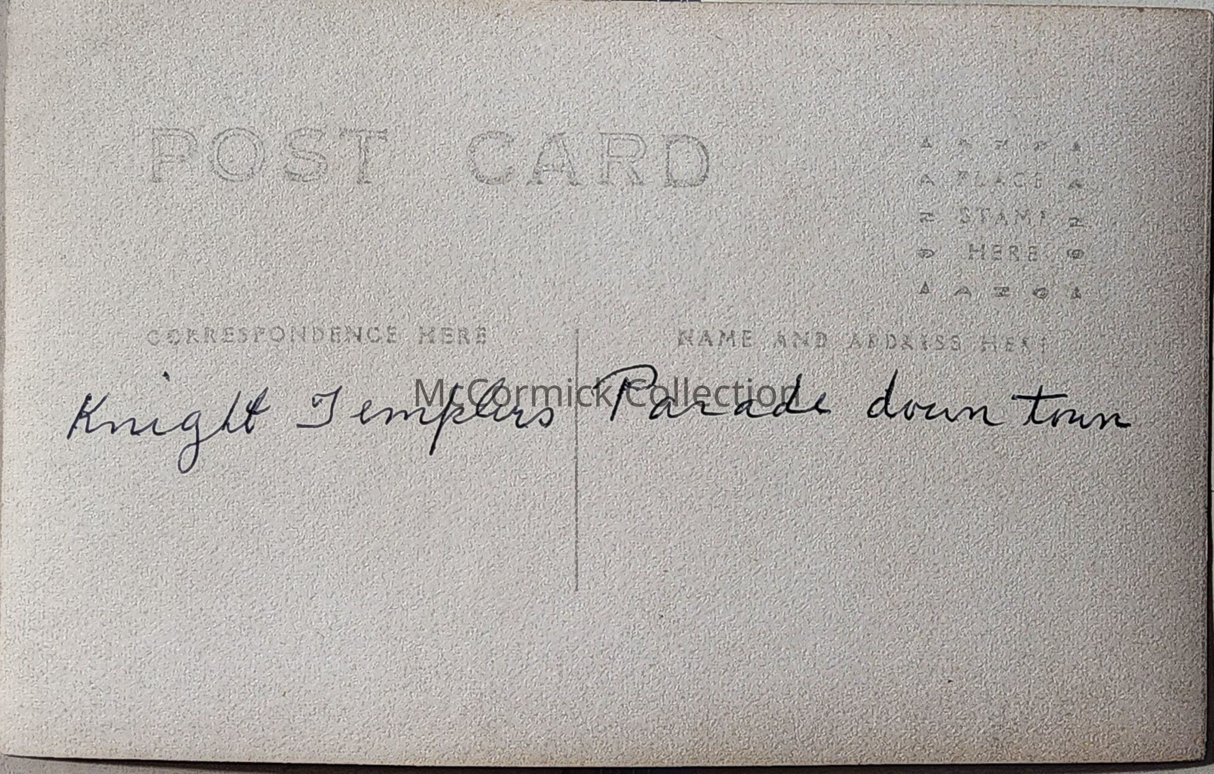 Real photo postcard of a Knights Templar Masonic parade on Washington Ave in Lansing. Reversed photo. The tower shown is Lansing City Hall. The building to the right with bunting is the Hollister Building. Taken from the roof of the Hudson House. Postally unused.