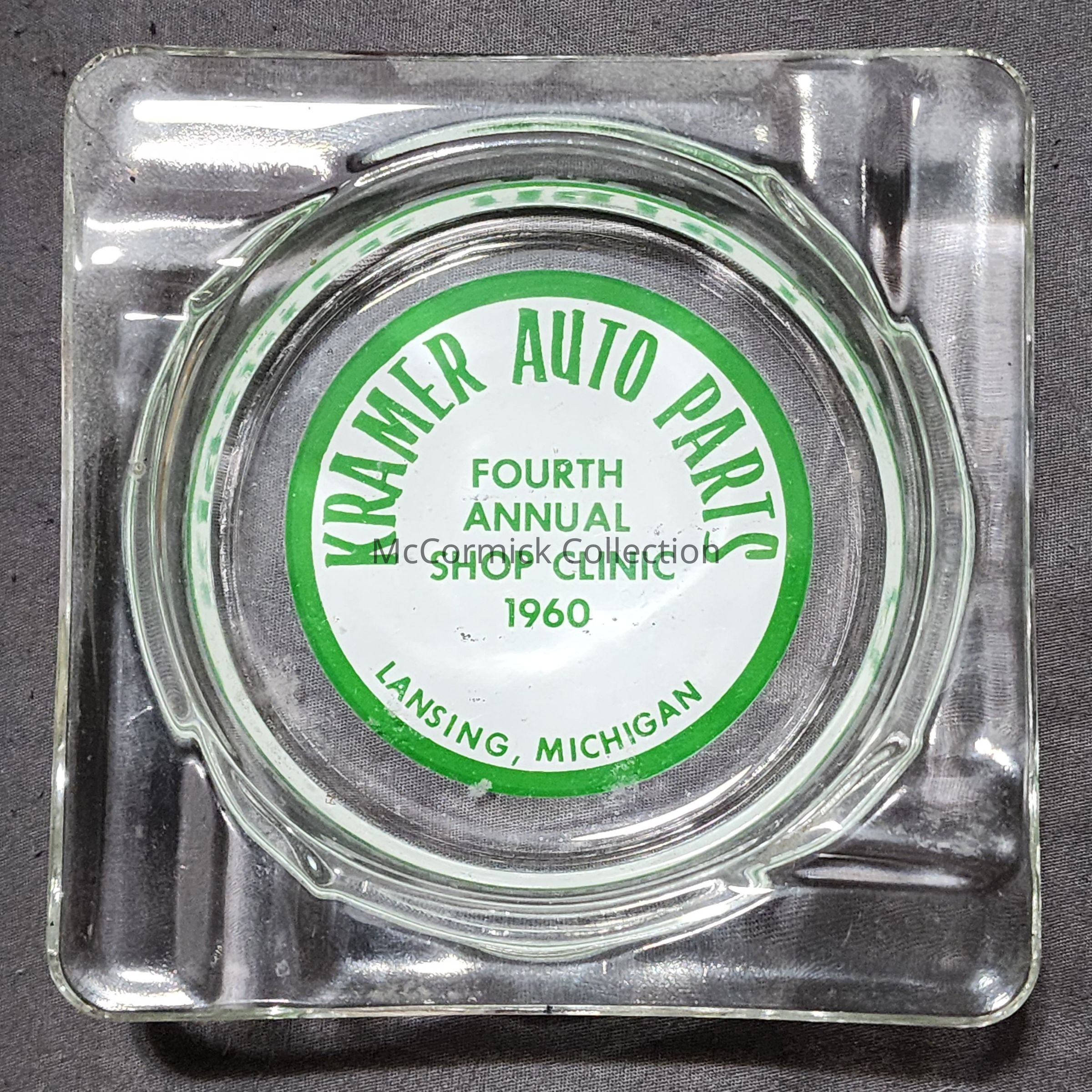A glass advertising ashtray for Kramer Auto Parts Shop Clinic in 1960 in Lansing, Michigan.