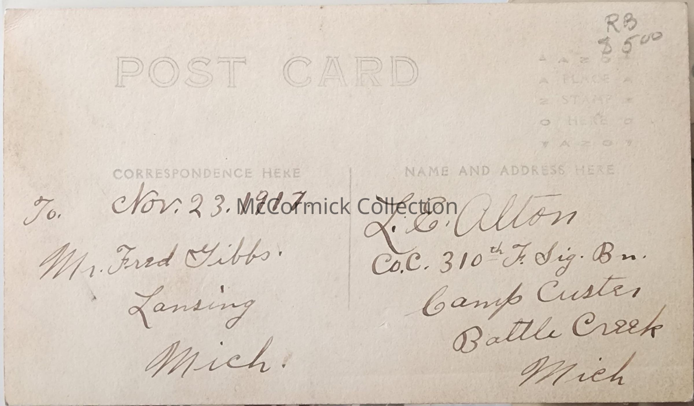 Real photo postcard of World War I soldier L.E. Alton. Sent to Fred Gibbs in Lansing. Dated 1917.
