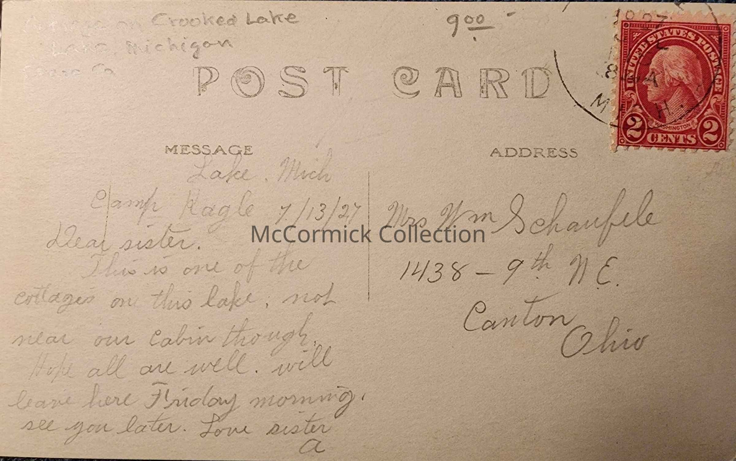 Cottage on Crooked Lake, Lake, Michigan. Postmarked 1927. Camp Hagle written on the message.