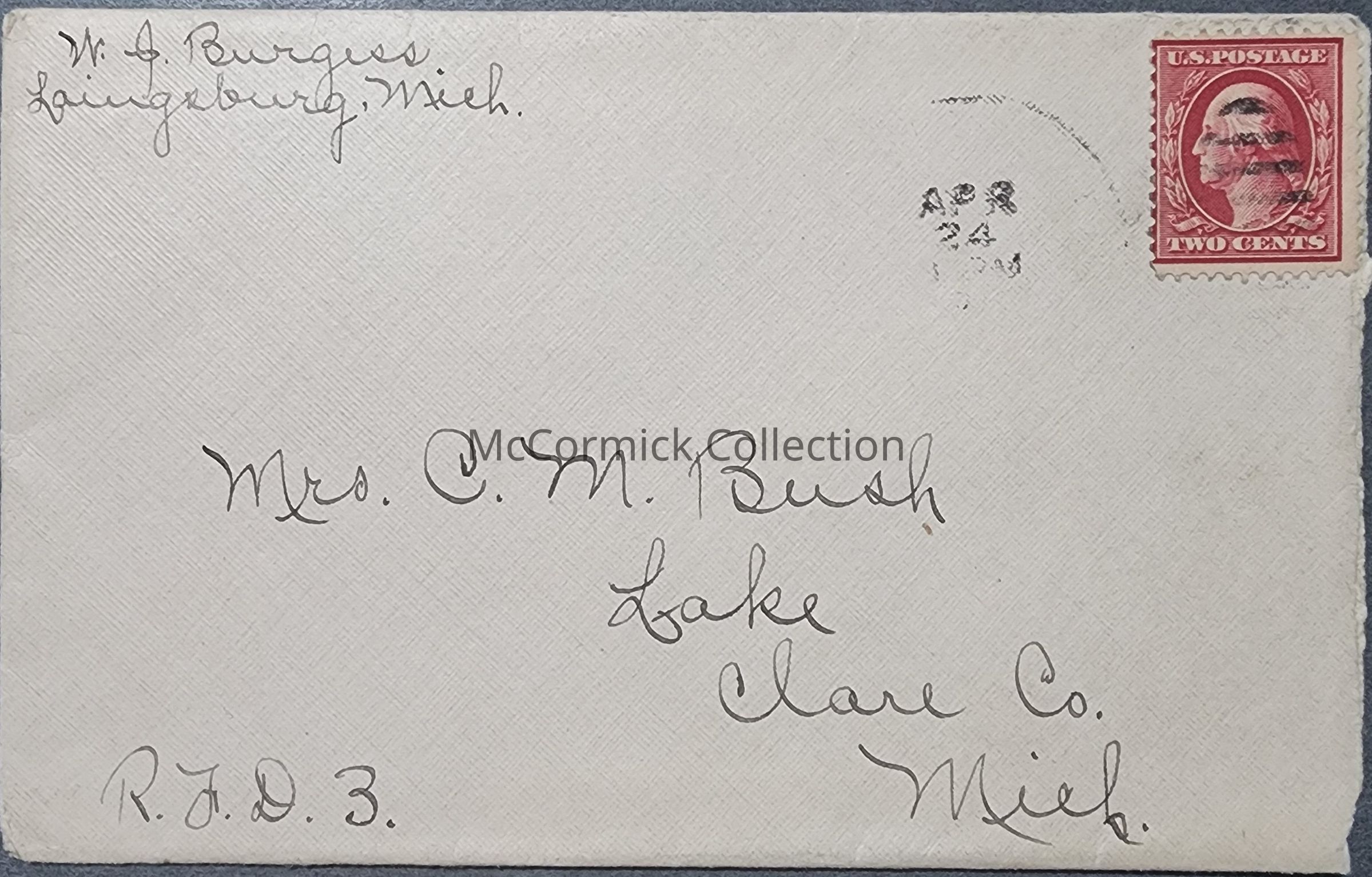 1912 Lake, Mich. postal cover and postmark. Addressed to Bush in Lake.