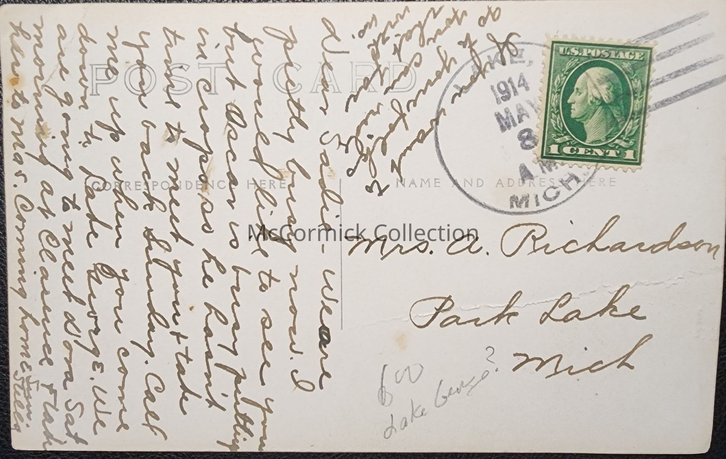 Real photo postcard of an unidentified body of water in Lake, Michigan. Postally used, 1914 Lake postmark. Message mentions Lake George. Addressed to Park Lake, Michigan.